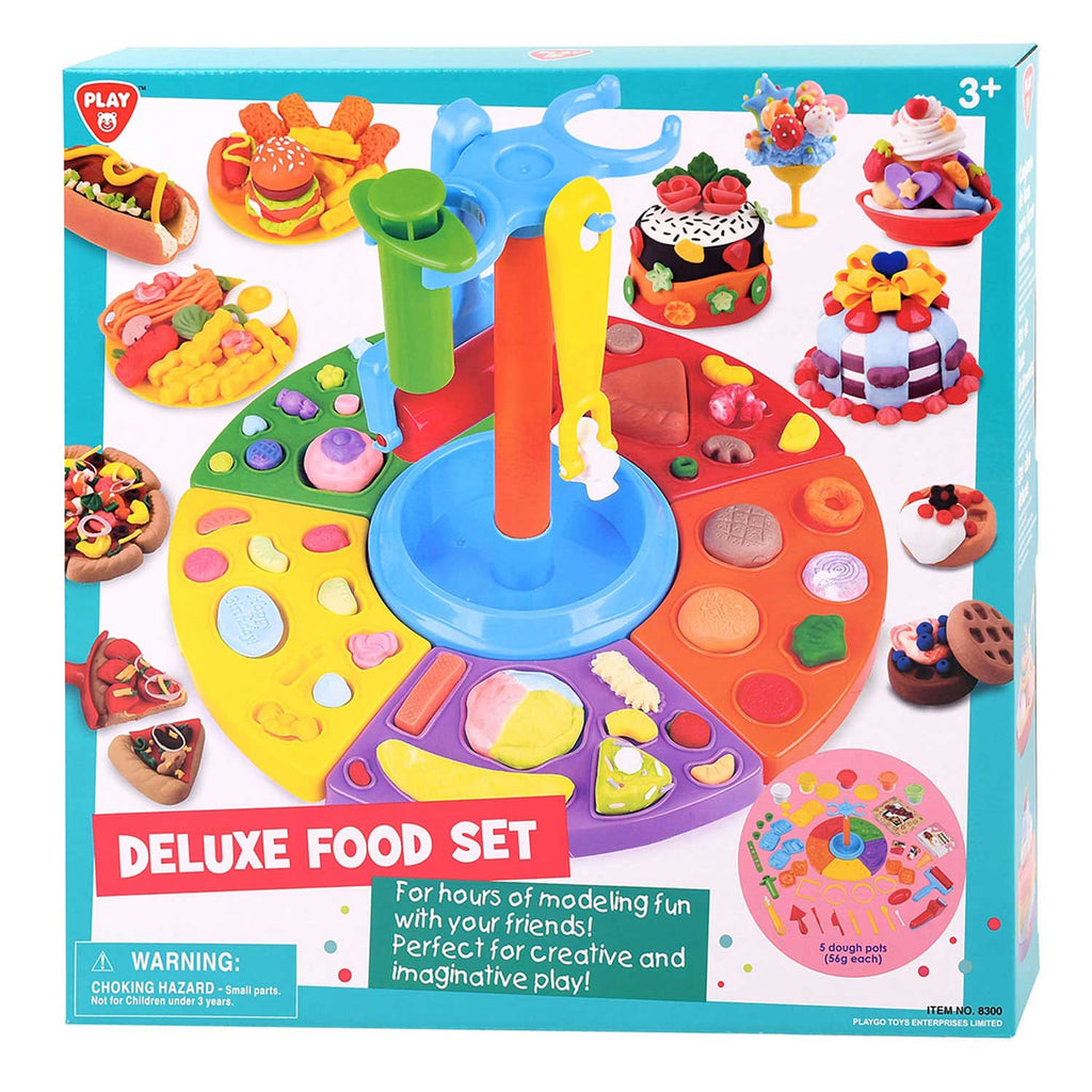 Play Kleiset Voedsel. In de kleiset zit een super grote kunststof mal waarin je allerlei verschillende kleivormpjes kunt maken zoals een pizzapunt, een hamburgerbroodje, snoepjes, cupcakes en allerlei toppings. In de kleiset vind je ook allerlei accessoires zoals een pizzadoos, een pizzaschep, bakjes, een patatzakje en verschillende kleivormpjes. Inclusief vijf verschillend gekleurde potjes klei.