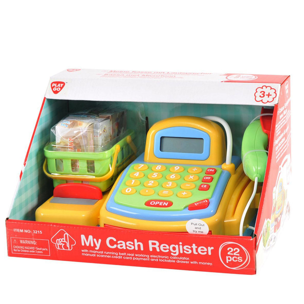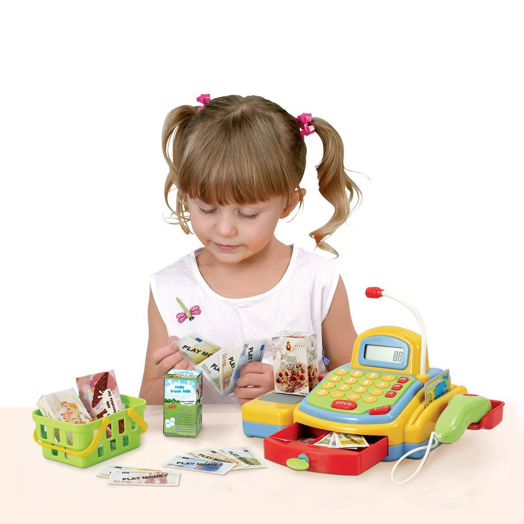 Speel een echte supermarkt na met deze speelgoed kassa van Play. Haal de spullen uit je mandje, beweeg de lopende band met de hendel en laat de boodschappen scannen. Bliep! De geluidjes van de scanner zijn net echt! Als er een artikel is zonder prijsje roep je met de echt werkende microfoon de supermarktmanager. “Kassa 1 assistentie alstublieft!”. Toets de bedragen in op de kassa en bereken het totaalbedrag. Open de lade met contant geld of laat de klant met de pin betalen. De speelgoedkassa is gemaakt van stevig kunststof in vrolijke kleuren. De set bevat bovendien een boodschappenmandje, boodschappen, speelgeld en een creditcard. Inclusief batterijen.
