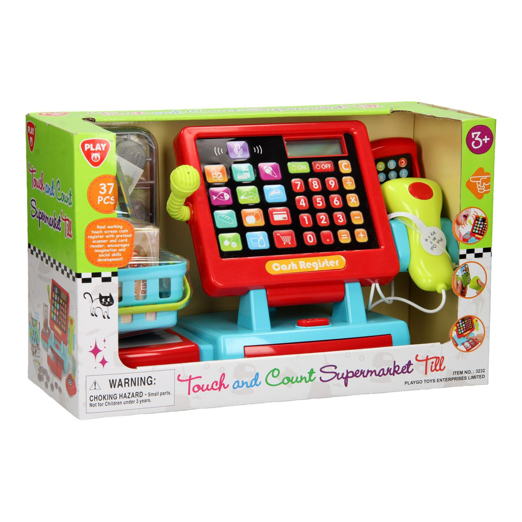 Deze Play Speelgoed Kassa is een musthave voor ieder kind, want wie wil er nou niet de cassière in de supermarkt naspelen! De kleurrijke speelgoedkassa is uitgerust met touchscreen, scanner en kaartlezer. Daarnaast krijg je er een winkelmandje met boodschappen, pinpas, brief- en muntgeld bij. De Play Kassa werkt op 2 AA batterijen (inbegrepen).