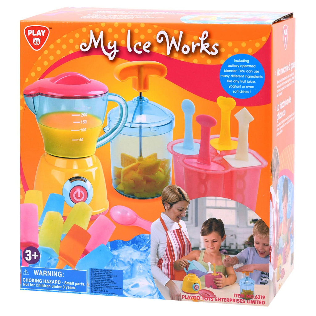 Gek op ijs? Met deze ijsset van Play maak je super eenvoudig je eigen ijslolly's. Er zijn geen grenzen aan je fantasie! Wat is jouw favoriete smaak? Het pakket bevat een blender, een fruitsnijder en vier gekleurde plastic ijslolly's. De blender werkt op 2 AA-batterijen (niet inbegrepen).