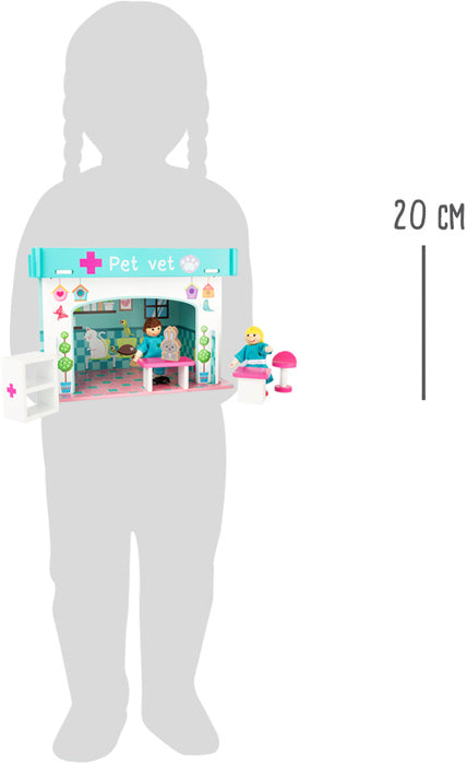 Soms moeten zelfs dieren naar het ziekenhuis! Hier worden ze allemaal weer gezond gemaakt door dierenartsen en hun assistenten - van schildpadden tot papegaaien. Met veel verschillende accessoires kunnen ze allemaal snel geholpen worden. De vier muren en het dak van robuust hout zijn eenvoudig in elkaar te zetten en zorgen steeds weer voor nieuwe fantasievolle speelavonturen. Geschikt voor poppen tot 12 cm.