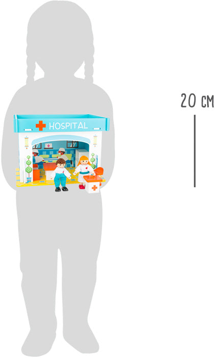 Heb je een kapotte knie en een bult op je hoofd? In dit ziekenhuis van robuust hout worden alle patiënten, jong en oud, snel weer gezond verpleegd! Dokter en verpleegster zijn inbegrepen. De vier muren en het dak van robuust hout zijn eenvoudig te monteren en zorgen steeds weer voor nieuwe fantasievolle speelavonturen. Geschikt voor poppen tot 12 cm.