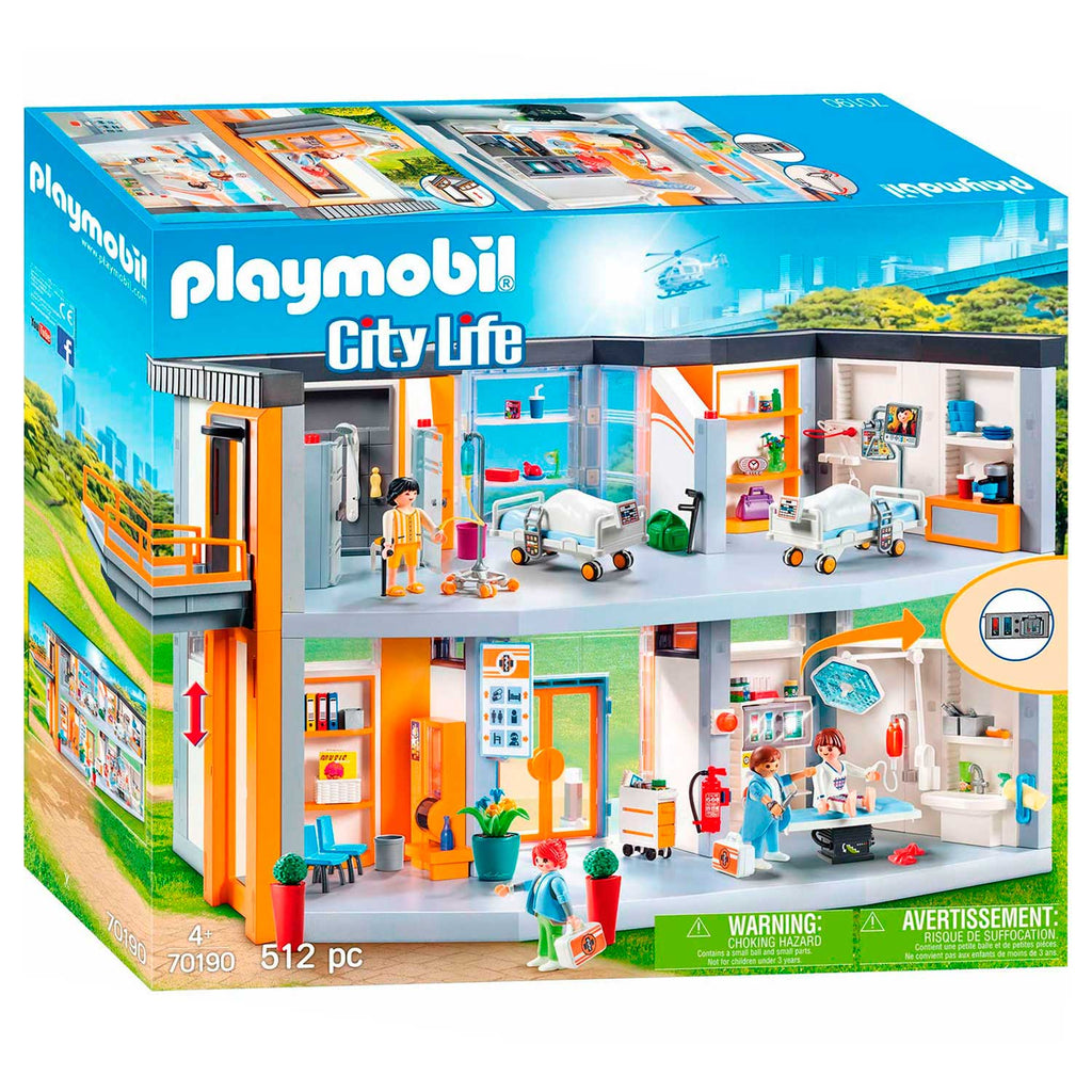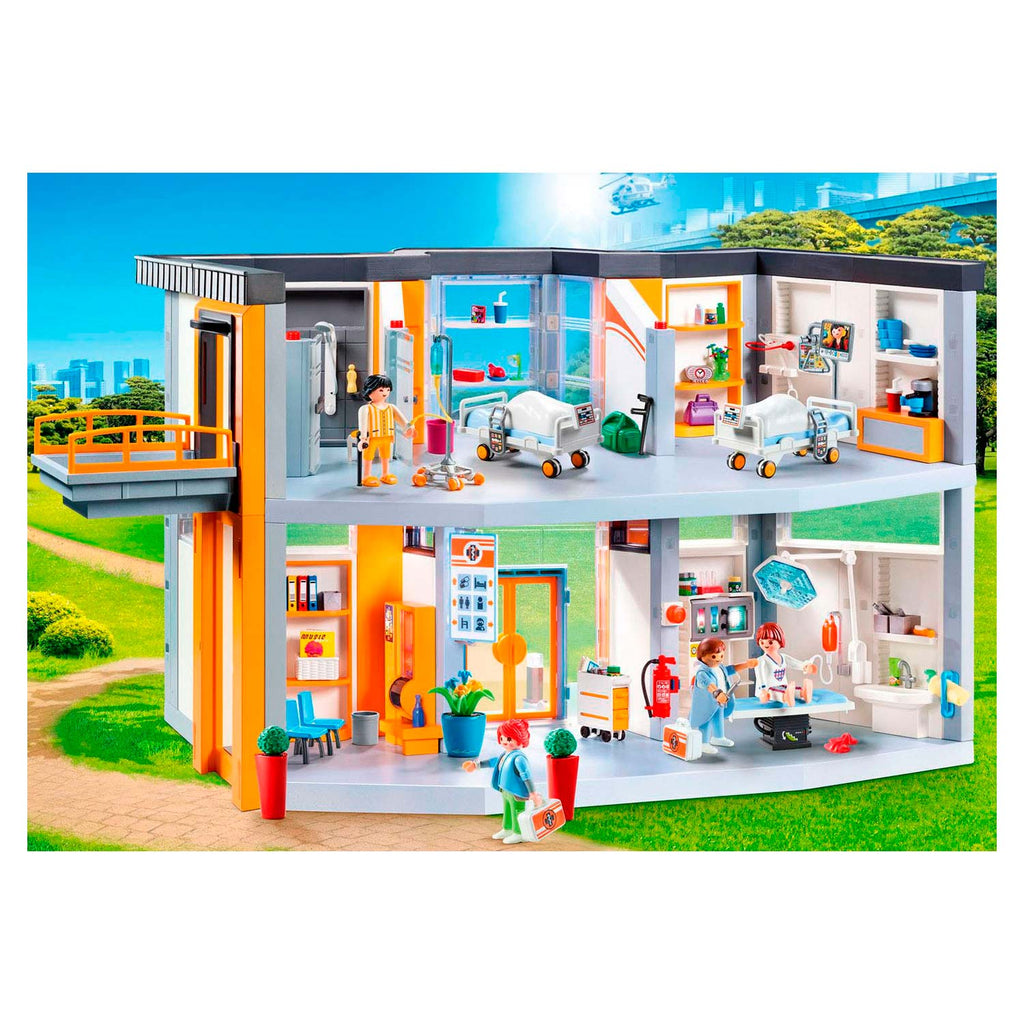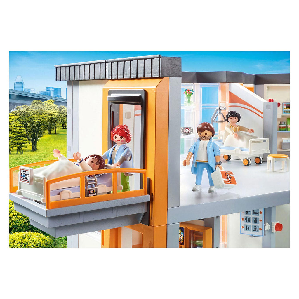 Het Playmobil 70190 Groot Ziekenhuis met Inrichting staat garant voor vele uren speelplezier! Op de 2 verdiepingen van het enorme huis gebeurt van alles. Met de lift vertrek je vanuit de wachtkamer met daarnaast de operatiekamer met draaibaar controlelampje, verlicht scherm en andere apparaten, naar de bovenverdieping. Hier is de patiëntenkamer, waarin 2 bedden op wielen staan met daarnaast een rolstoelvriendelijke badkamer. Er worden 4 poppetjes (2 artsen en 2 patiënten) en vele accessoires, waaronder een looprekje, operatietafel, koffieapparaat en 2 bedden bij het Playmobil 70190 Groot Ziekenhuis geleverd. Afmeting: 70x31x34 centimeter.