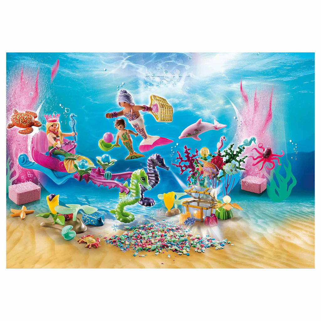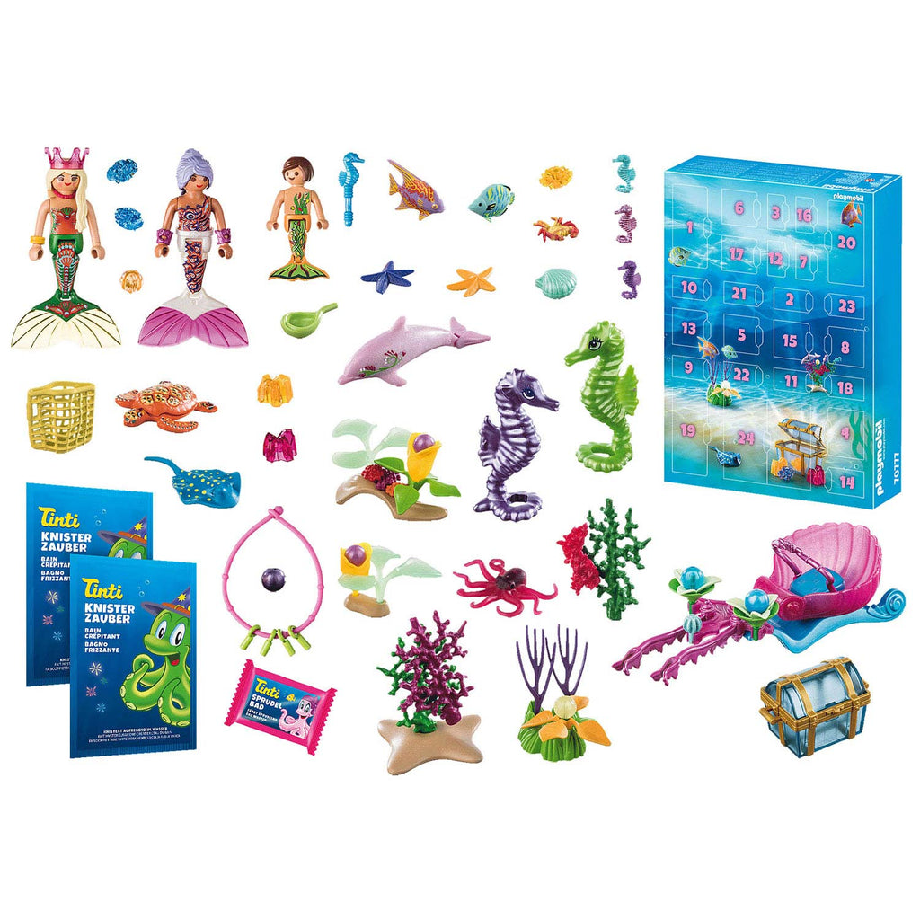 24 dagen wachten tot kerstavond? Dat kan best lang zijn - maar niet met de kleurrijke PLAYMOBIL adventskalenders. Deze adventskalender neemt je mee naar het fantastische rijk van de zeemeerminnen. Een zeemeermin en haar zoon zijn op zoek naar waardevolle parels wanneer de zeekoningin op haar zeepaardenkoets arriveert en haar hulp aanbiedt. Wie kan nee zeggen tegen dit koninklijke aanbod? Samen vinden ze een prachtige, glinsterende blauwe parel, die ze onmiddellijk in hun net opbergen. De speelset bevat een adventskalender met 24 verrassingen, twee zeemeerminnen en een zeemeerminjongen, een zeepaardenkoets, twee grote zeepaardjes, een babydolfijn, een zeeschildpad, een pijlstaartrog, een baby-octopus, zeester, visnetten, een schatkist, koraal en nog veel meer magische extra's voor geweldig speelplezier in de oceaan. Geweldige badproducten: Tinti Knisterzauber en badplezier zorgen voor bruisend spetterplezier.