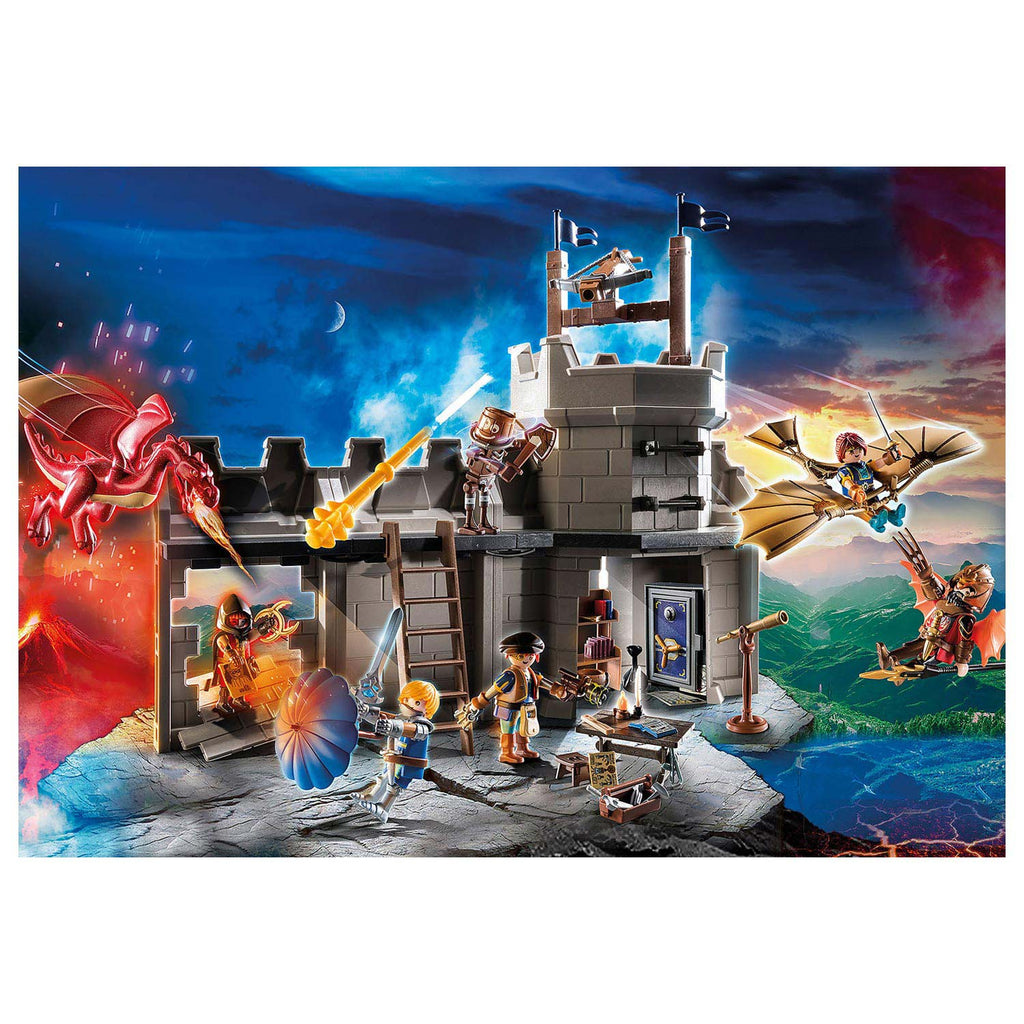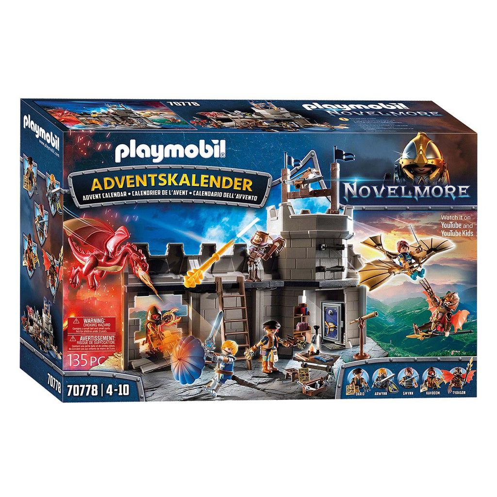 24 dagen wachten tot kerstavond? Dat kan best lang zijn - maar niet met de spannende PLAYMOBIL adventskalenders. Deze Novelmore adventskalender brengt je naar Dario's fantastische wereld van uitvindingen. Keer op keer, bedenkt de slimme uitvinder Dario DaVanci nieuwe gereedschappen, vliegmachines of wapens. Hij heeft zojuist een ingenieuze trainingsmachine voltooid die de ridders van Novelmore zal helpen trainen voor de strijd. Ondertussen test Gwynn de nieuwe paraglider en springt van de kasteelmuur. Vanuit de lucht, ziet ze Burnham Raiders Kahboom en Tyragon die een gat in de kasteelmuur proberen te maken en er vliegt ook een gevaarlijke draak binnen! Gelukkig is Arwynn alert en zal hij het kasteel verdedigen met behulp van Dario's slimme uitvindingen. De speelset bevat een adventskalender met 24 verrassingen, Novelmore-personages Dario, Gwynn en Arwynn, evenals Burnham Raiders Kahboom en Tyragon, een draak, een torenelement met kruisboog, een trainingsmachine, een paraglider, verschillende gereedschappen, boeken, een telescoop en nog veel meer toffe extra's.