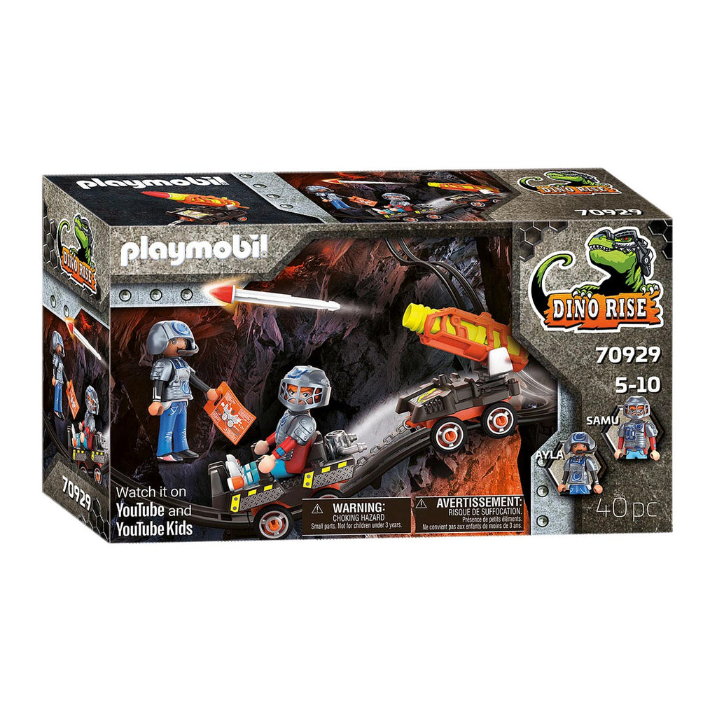 Zoals altijd reizen Ayla en Samu samen, dit keer met hun tweezits mijnkruiser. De Dino Mine-raketkart is afgestemd op het spoor van de spoorlijn in de Dino-mijn en is uitgerust met een werkend kanon. Met dit voertuig, zijn broer en zus gegarandeerd van een spannende rit. De set bevat Ayla en Samu van Team Dino Rise, een raketkart met aanhanger en geïntegreerd kanon, twee raketten, een blauwdruk, koevoeten en vele andere extra's voor snel speelplezier.