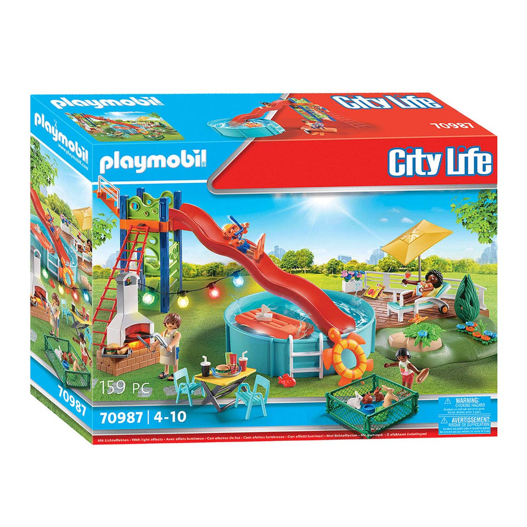 Zwembadfeest met glijbaan. Met een golfglijbaan, een te vullen zwembad, een gloeiende grill (vereist 2 x 1.5V microbatterijen), gloeiende lantaarns (vereist 1 x 1.5V microbatterij) en vele andere accessoires. Een geweldige sfeer gegarandeerd op het coole zwembadfeest met glijbaan. Klim op het rek en glij vanaf de golfglijbaan naar beneden in het koele water. Na de pret in het zwembad kunnen bewoners en gasten zich verheugen op heerlijke worstjes en hamburgers van de grill. Terwijl de kinderen zich vermaken, ontspant mama zich op de ligstoel. De konijnen in het buitenverblijf moeten ook plezier hebben en water en vers voedsel krijgen. 's Avonds wordt de lantaarnketting aangezet en zit iedereen vrolijk bij elkaar en vertelt elkaar over de avonturen van de dag. De set bevat twee PLAYMOBIL-figuren en twee kinderfiguren, vier konijnen, een schuifverlenging, een lantaarnketting, een klaptafel, stoelen, hotdogs, hamburgers en drankjes en vele andere extra's voor een geslaagd feest. Het flikkerende licht van de barbecue kan met een knop worden ingeschakeld. Het zwembad kan met water worden gevuld en kan afzonderlijk of in combinatie met de bodemplaat worden opgesteld. Werkt op 3 AAA batterijen (niet inbegrepen).