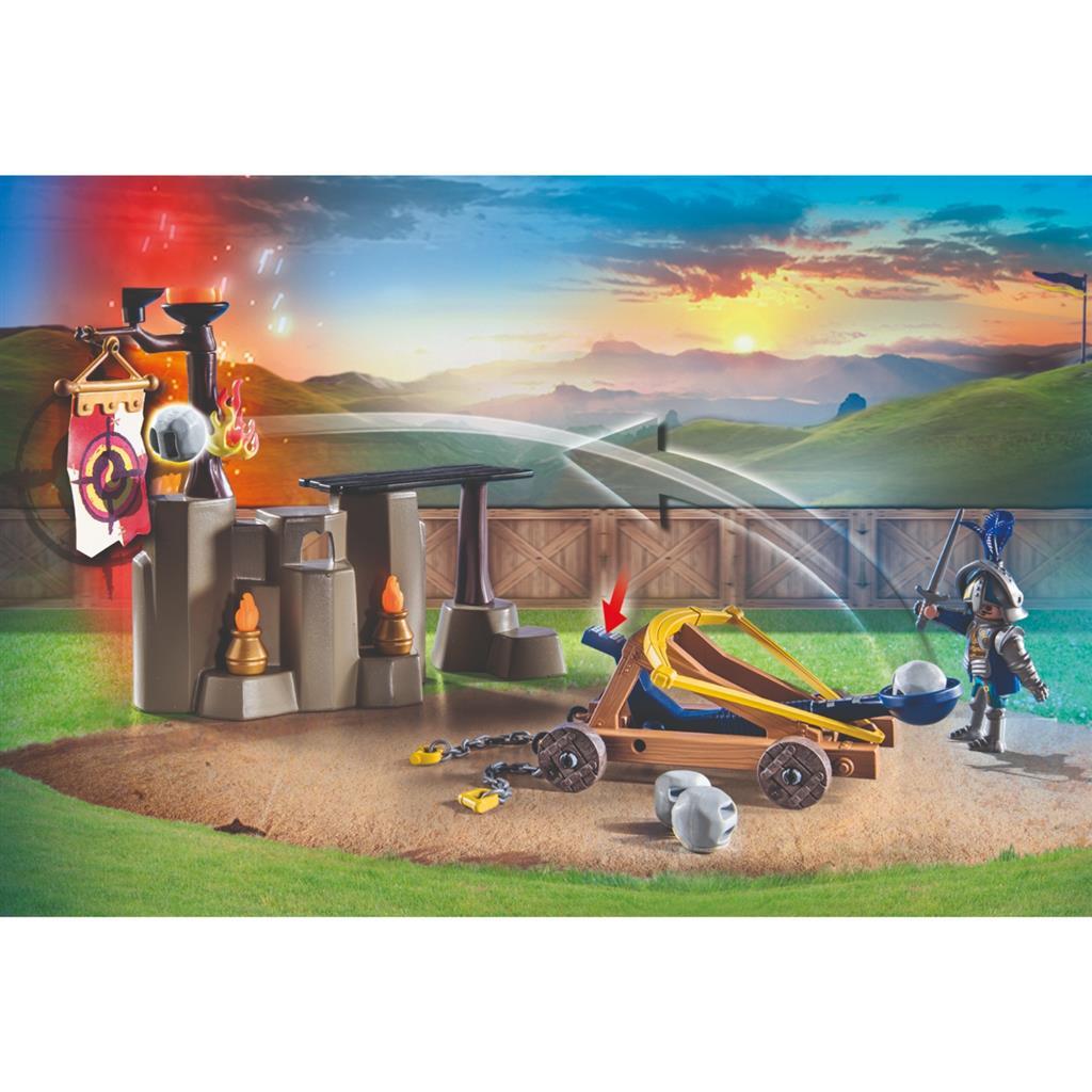 In een van de vele disciplines van het steekspel, duelleert generaal McGriffin met katapult en Tyragon, de drakentrainer van de Burnham Raiders, met zijn vuurdraak. Welkom bij het geweldige Novelmore Knights-toernooi! Hier ontmoeten de dapperste ridders elkaar en meten ze hun vaardigheden in verschillende disciplines. De onverschrokken generaal McGriffin en Tyragon, de drakentrainer van de Burnham Raiders, duelleren ook op het toernooiterrein. Generaal McGriffin laadt de katapultstenen en mikt op de wilde vuurdraak. Maar de draak is sneller, stijgt op en zo vliegen de stenen de leegte in. Ondertussen probeert Tyragon zoveel mogelijk vuurprojectielen door de ringen aan de Novelmore-kant te schieten en zoveel mogelijk punten te behalen. Het zal spannend zijn om te zien wie als winnaar uit de strijd komt. Een speelset boordevol actie met een bewegende draak, werkende katapult en spannende personages biedt veel ideeën voor spannende ridderavonturen. Geschikt voor kinderen vanaf 4 jaar.
