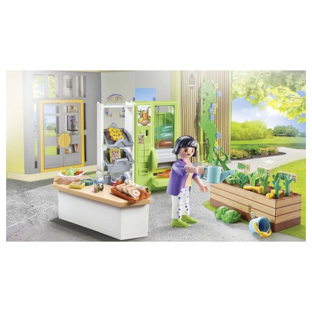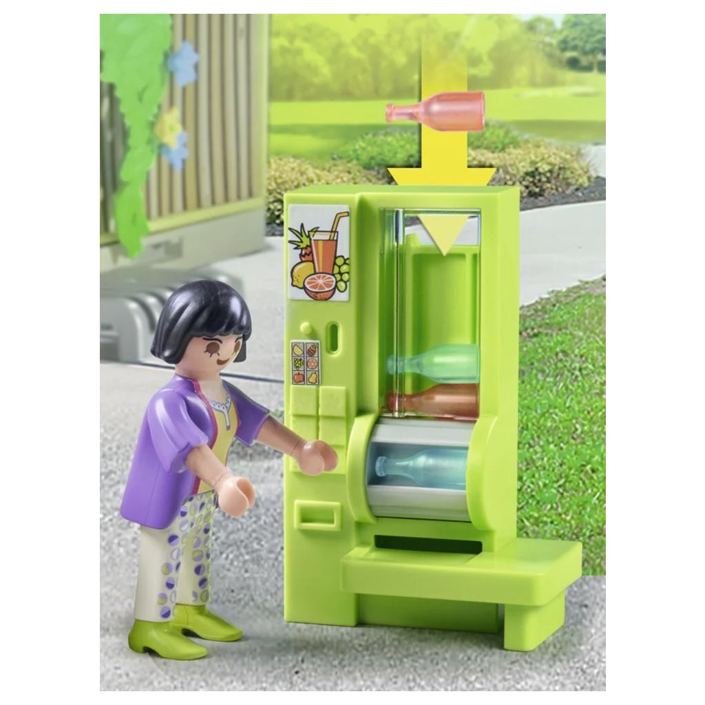PLAYMOBIL Verkoopstand met een PLAYMOBIL figuur, toonbank, fruit, snacks en een vulbare flessenautomaat.