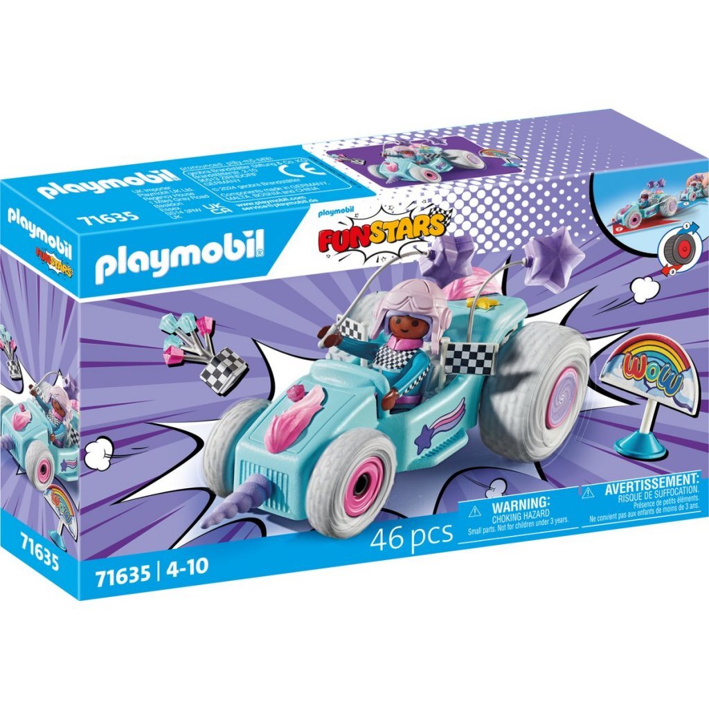 Op uw plaatsen, klaar... Zonder aarzelen zoeft de eenhoornracer weg in haar suikerzoete en kleurrijke kart met intrekbare motor. Vloeiende eenhoornmanen, lila stervormige ballonnen en fonkelende aandrijfkristallen betoveren haar concurrenten. Spannende races, hindernissen nemen of gekke stunts uithalen.Deze te gekke race-eenhoorn is perfect voor alle fans van auto's en mythische wezens! De leuke carrosserie met een eenhoorn op de grille kan worden uitgebreid met nog meer fantastische add-ons. In het voertuig is plaats voor een figuur. Dankzij de praktische intrekbare motor zijn razendsnelle speelavonturen gegarandeerd. Een fantastisch cadeau of souvenir voor autoliefhebbende kinderen vanaf 4 jaar.
