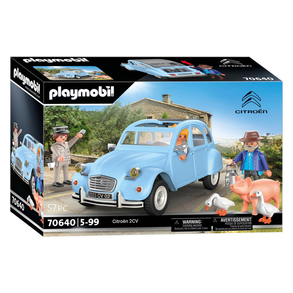 De speelgoedset bevat een Citroën 2CV van PLAYMOBIL, drie PLAYMOBIL-figuren, een varken, twee ganzen, twee melkkannen, koplampen en nog veel meer leuke extra's. Een perfect cadeau voor autoliefhebbers en nostalgiefans.