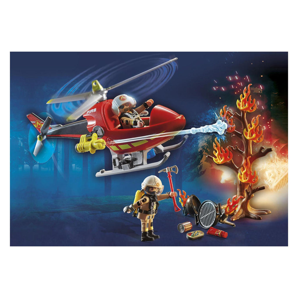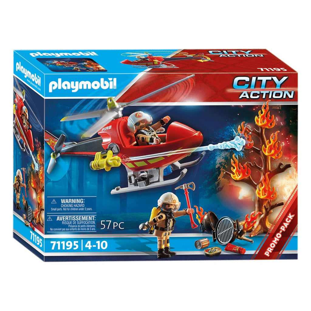 De Playmobil 71195 Brandbestrijding Helikopter bevat een helikopter met werkende rotorbladen, een waterstraalspuit, twee brandweermannen en diverse leuke accessoires. Te combineren met andere brandweer speelsets waaronder 71193 en 71195, en geschikt voor kinderen vanaf 4 jaar oud.