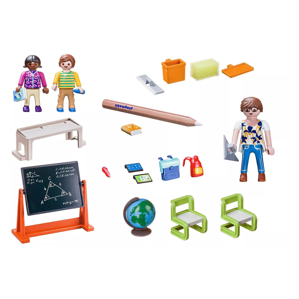 Schoolfans zullen dol zijn op de gedetailleerde PLAYMOBIL School meeneemkoffer. Vandaag is het wiskundeles en de leraar legt alles uit en schrijft de formule op het schoolbord. Wie kan het probleem oplossen? Deze gemakkelijke en handige meeneemkoffer bevat alles wat scholieren nodig hebben om thuis schooltje te spelen: juf, schoolbord, boeken, bureaus, stoelen, rugzakken en vele andere extra's. Als de speeltijd voorbij is, berg je de stukken gewoon op in de koffer voor de volgende keer! "
