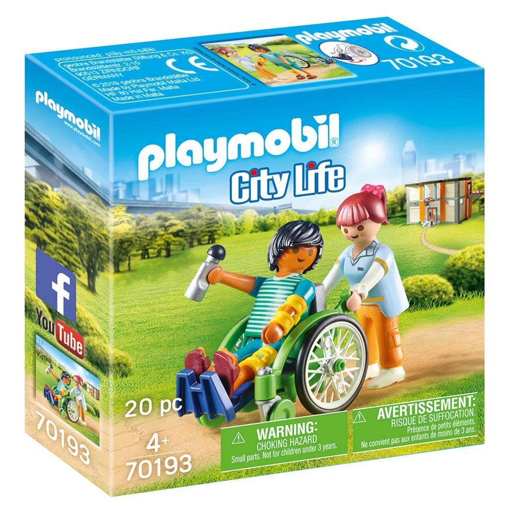 PLAYMOBIL 70193 Patient in rolstoel met uitklapbare voetsteun. De spalk voor armen en benen kan flexibel worden versteld.
