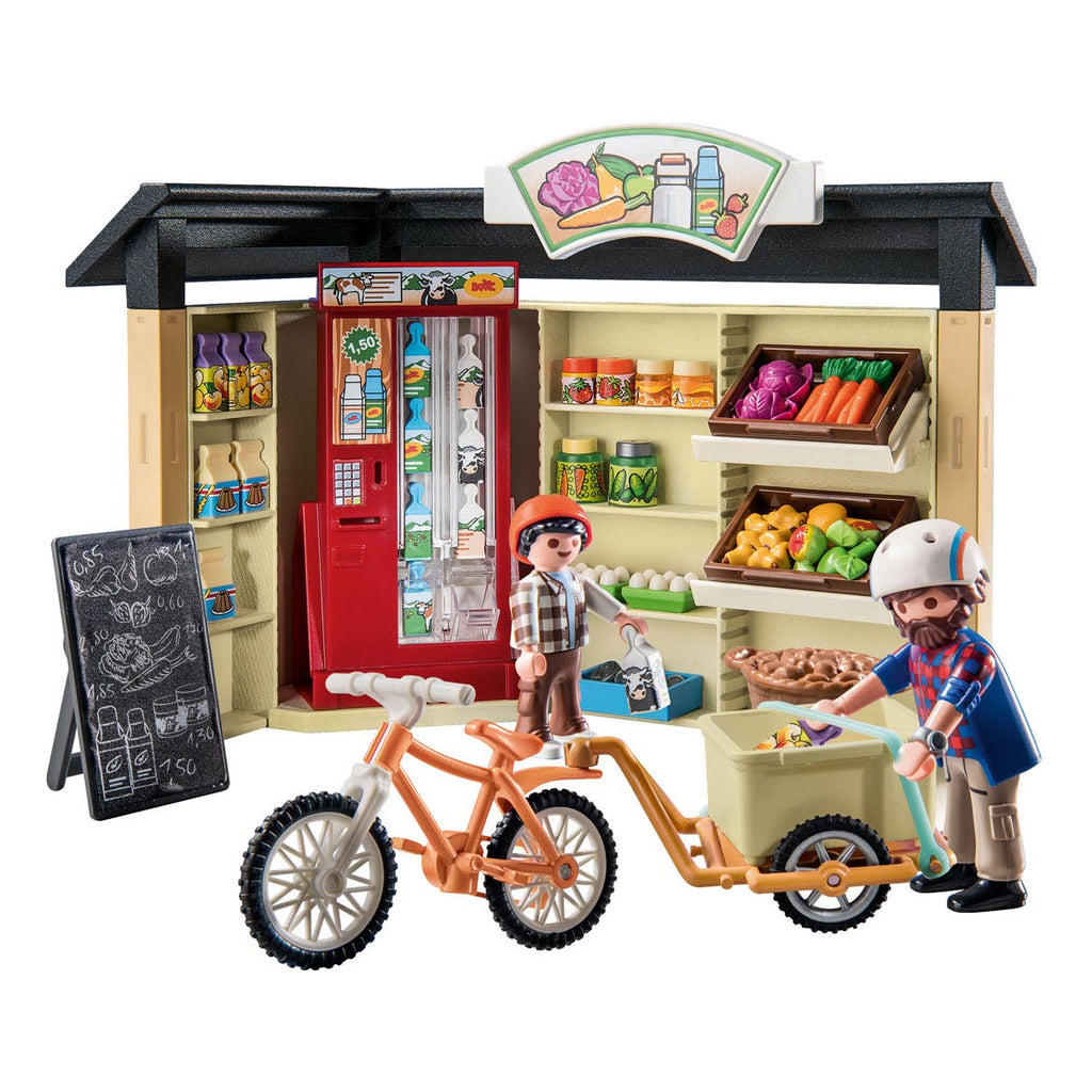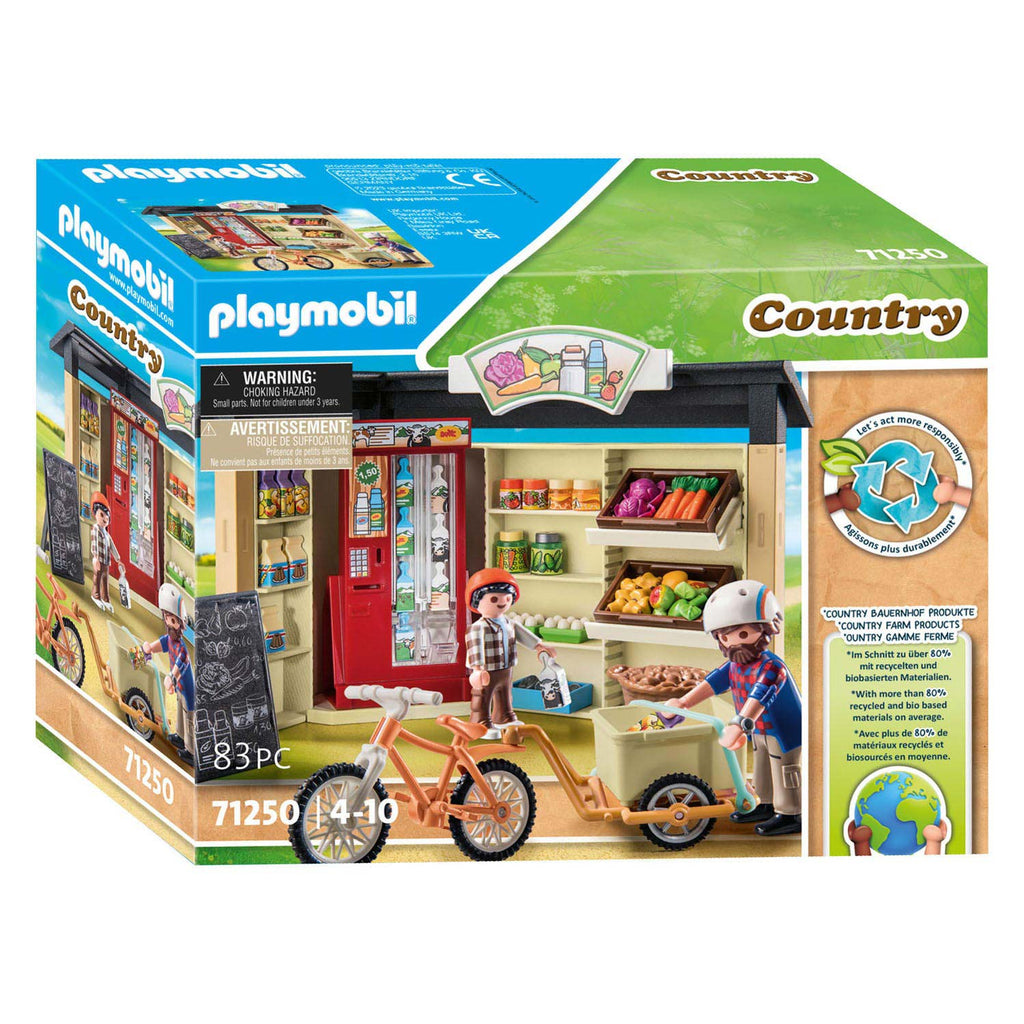 In dePlaymobil 71250 Country boerderijwinkel met zelfbediening is voldoende ruimte voor alle verse producten. Flessen zijn te koop bij de flessenautomaat. De gekochte producten uit de boerderijwinkel kunnen worden opgeborgen in de fietskar. Vers, regionaal en bij voorkeur biologisch - zo hoort eten te zijn. Klanten kunnen 24 uur per dag vers fruit, groenten, zuivelproducten en drinken kopen tegen eerlijke prijzen. De boer oogst de groenten vers van het land en brengt ze rechtstreeks naar de boerderijwinkel. De boodschappen kunnen netjes worden geordend en goed gepresenteerd worden in de schappen. De set nodigt kinderen uit om in de rol van boer en winkelier te kruipen en grappige verkoopsituaties na te spelen. De 83-delige set bevat twee figuren, een boerderijwinkel met een melkautomaat, eieren, fruit, groenten en diverse andere etenswaren. Geschikt voor kinderen vanaf 4 jaar.