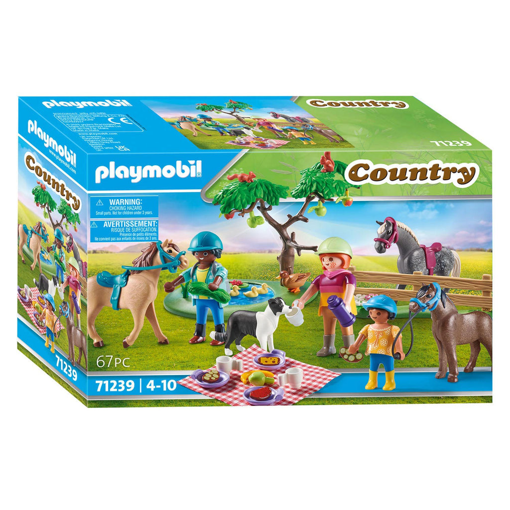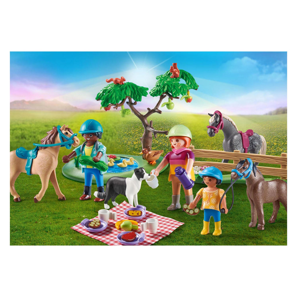 Plezier op vier hoeven bij de picknicktocht met paarden van PLAYMOBIL! Na een lange rit over weilanden en velden maken de ruiters het zich gemakkelijk op de deken en genieten ze van een heerlijke picknick. Ondertussen grazen de paarden ontspannen in de wei. Eenmaal bijgekomen, zetten de ruiters de rijhelmen weer op en stappen ze weer in het zadel. Talloze details en liefdevol ontworpen paardenfiguren zorgen ervoor dat kinderen een geweldige speelervaring hebben. Productdetails: De kleurrijke, 67-delige paardenset voor kinderen van 4 jaar en ouder bevat drie PLAYMOBIL-figuren, twee paarden, een pony, een border collie, rijhelmen, zadels en een picknick. De volwassen figuren kunnen de paarden met een zadel berijden. Het hoofddeksel van alle figuren kan worden verwijderd. Voor nog meer speelplezier kan de picknickexcursie gecombineerd worden met de andere speelsets uit de PLAYMOBIL Country-themawereld.