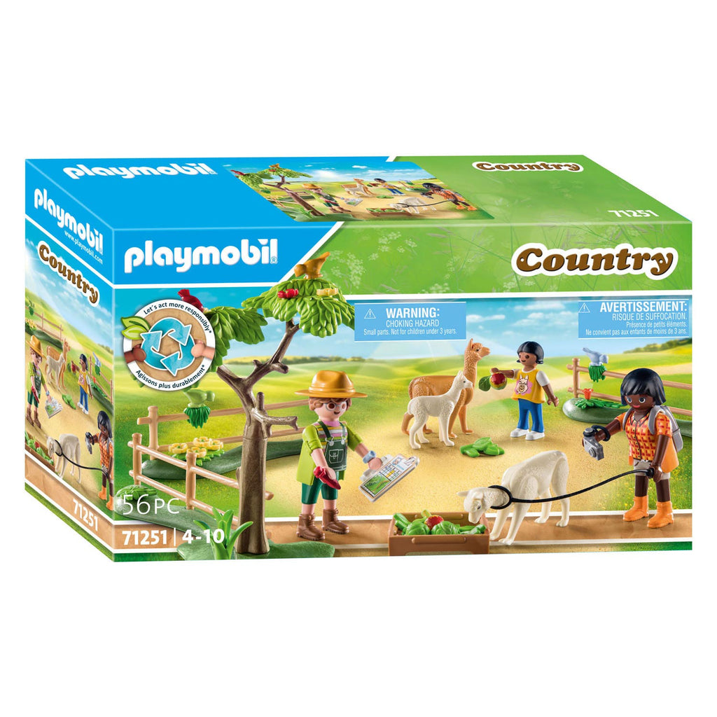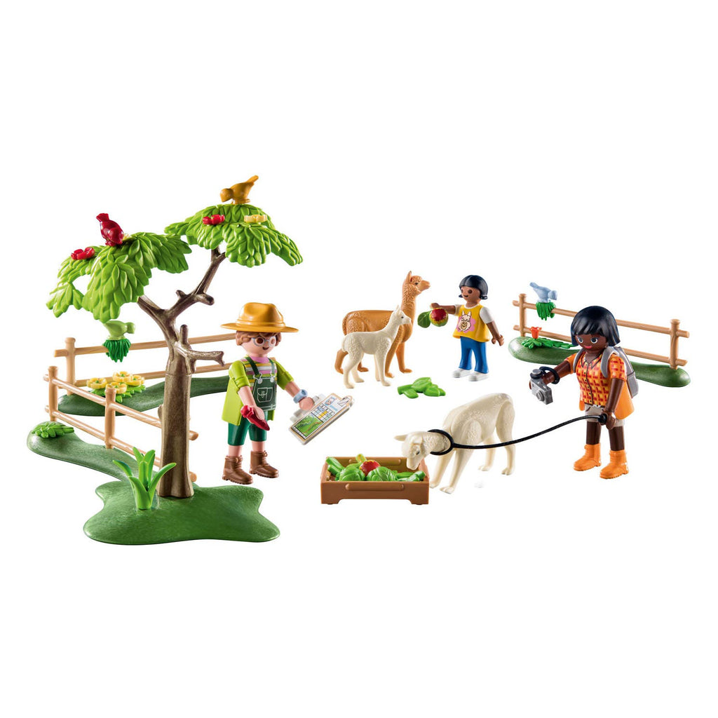 Een wandeling met alpaca's is een heel bijzondere ervaring. Het van dichtbij bekijken en aaien van de pluizige dieren is leuk voor zowel kinderen als volwassenen. Tegelijkertijd valt er veel te leren over het dieet en de levensstijl van deze fascinerende dieren.De schattige alpaca's kunnen geleid worden met behulp van het halster. Groenvoer is beschikbaar als beloning. De 56-delige set bevat drie speelgoedfiguren, twee alpaca's en twee baby alpaca's, sla, appel, eten en andere extra's voor een leuke alpacawandeling. Geschikt voor kinderen vanaf 4 jaar.