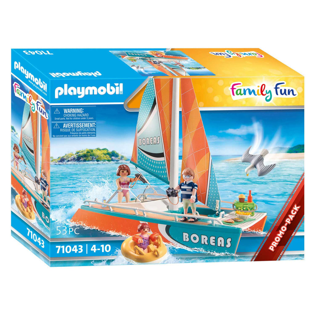 De zee roept! Beleef spannende vakantiedromen op de PLAYMOBIL drijvende catamaran. De catamaran heeft een brug met stuurwiel, een zitgedeelte met glazen vloer, een zonnenet, twee zeilen en heel veel lekkers voor een ontspannende dag op zee. Het kleine meisje kan in een zwemring door het water worden getrokken.Twee zwembandjes zorgen voor de nodige veiligheid. Een leuk cadeau voor kinderen vanaf 4 jaar. Het limited edition PLAYMOBIL-promopakket bevat drie PLAYMOBIL-figuren, een catamaran, een zwemring, een koeltas, een fotocamera en tal van andere extra's voor het naspelen van leuke vakantie-ervaringen. Zwembandjes, badhanddoek, horloge en slippers zijn afneembaar. Deze speelset is ook ideaal te combineren met andere sets uit de PLAYMOBIL Family Fun-serie.