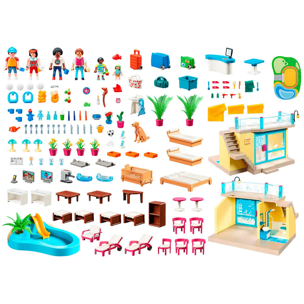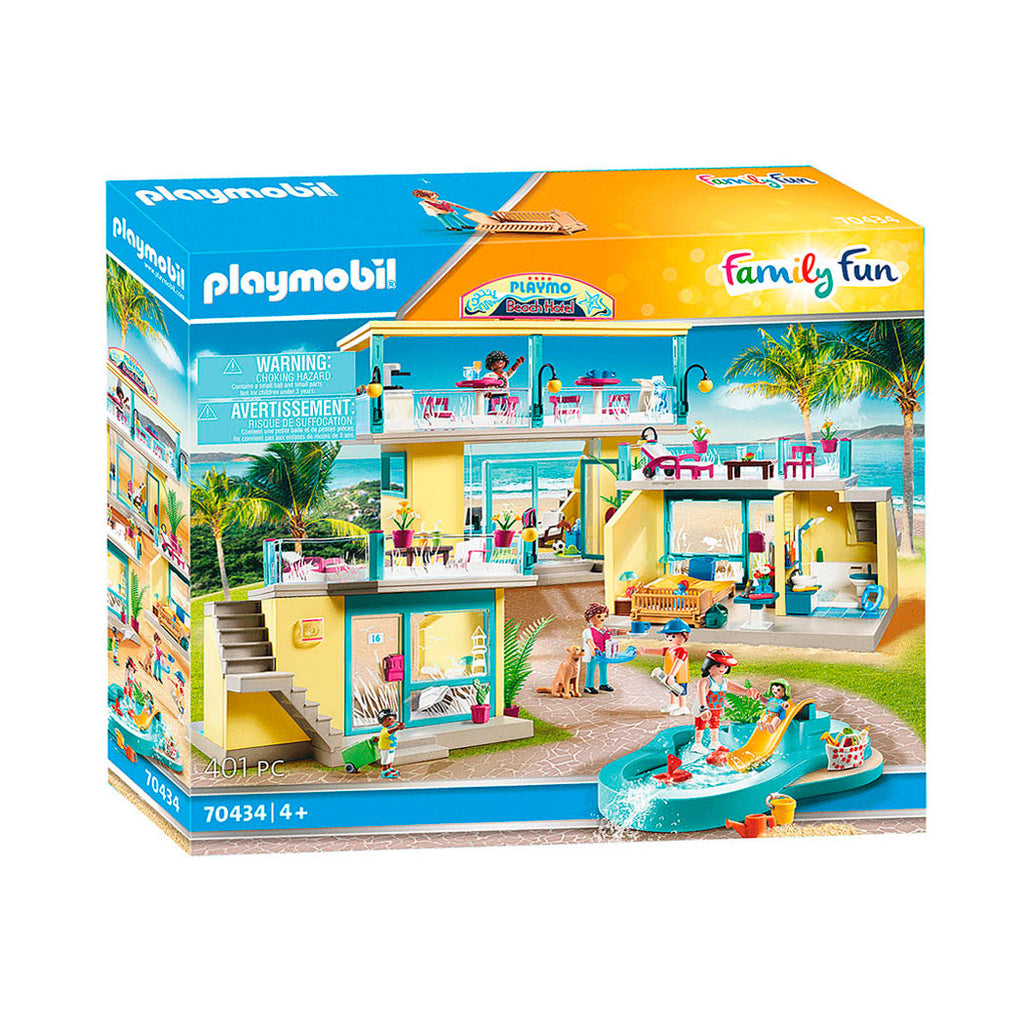 Het grote hotelgebouw van het Playmo Beach Hotel nodigt je uit voor een familievakantie op het strand. Afmetingen hoofdgebouw met receptie: 31x23x30cm (LxBxH). Bungalow afmetingen: 29x22x19cm (LxBxH). Het Playmobil Strandhotel bestaat uit 401 onderdelen.