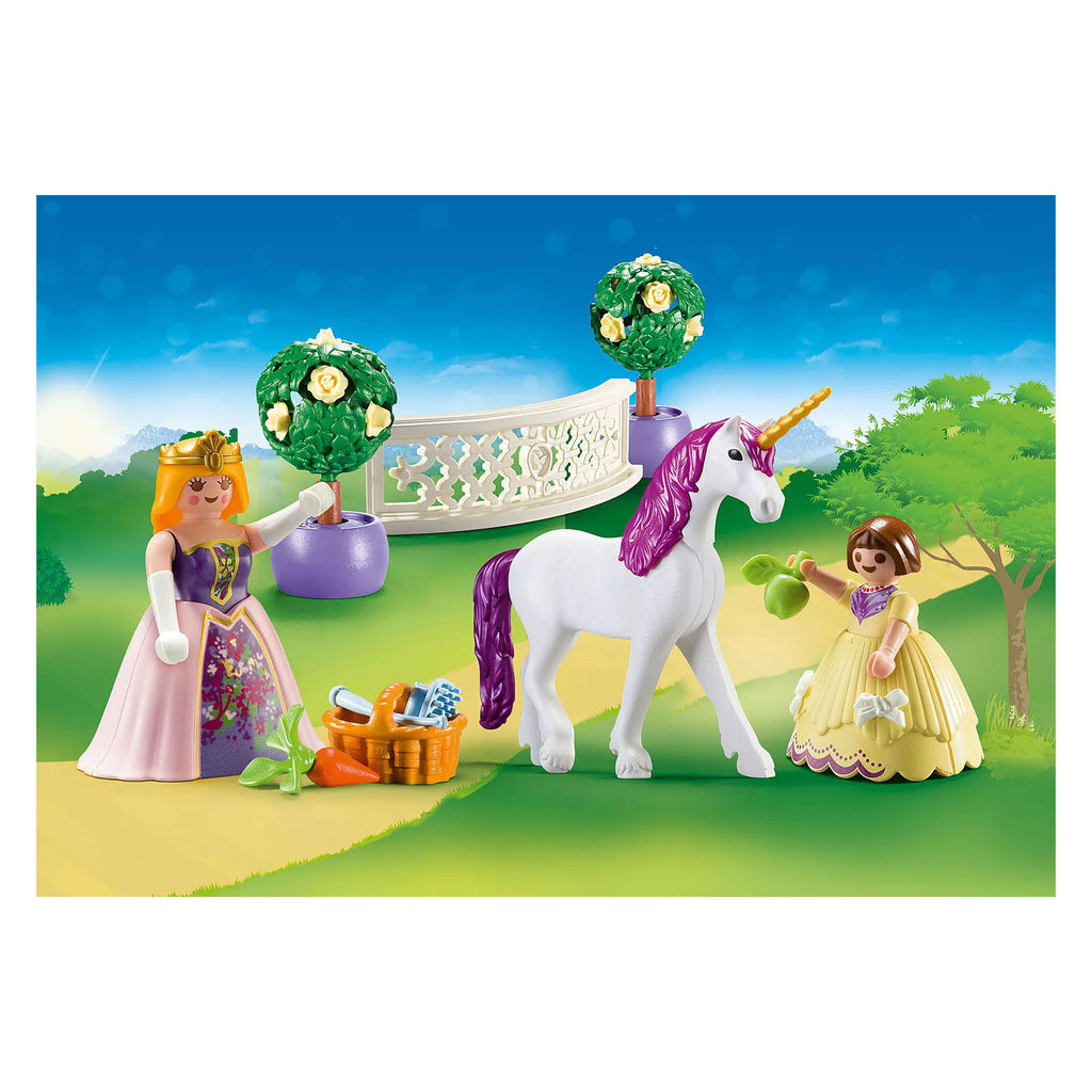 De speelfiguren set bevat twee PLAYMOBIL figuren, een eenhoorn, een mand, een appel en vele andere charmante extra's."