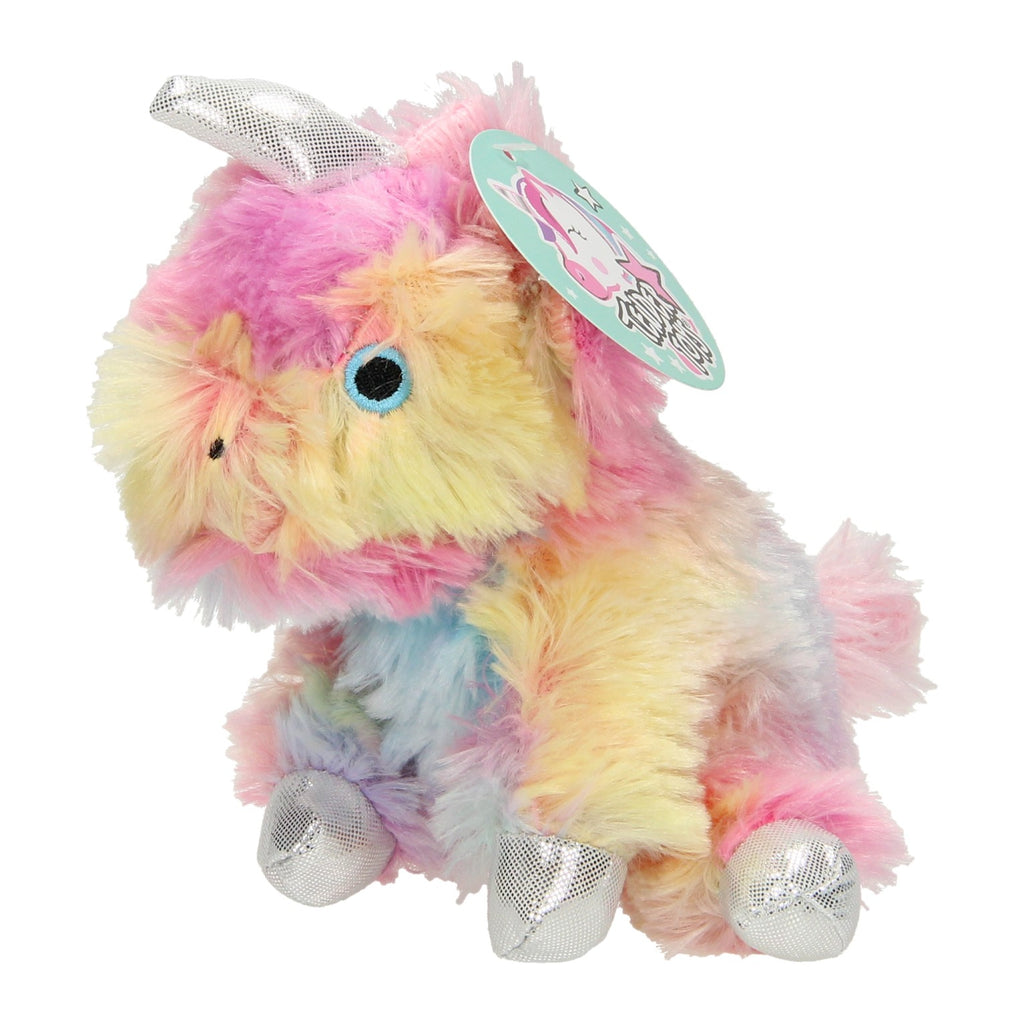 Pluchen eenhoornknuffel met tie-dye patroon in drie varianten. De eenhoorn heeft een glinsterende hoorn en glinsterende hoeven. De eenhoornknuffel is 14 centimeter groot en geschikt voor kinderen vanaf 3 jaar.