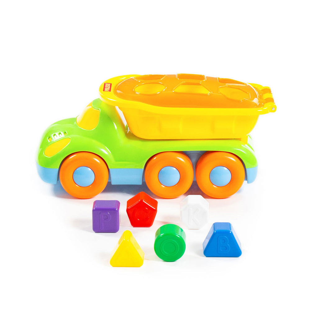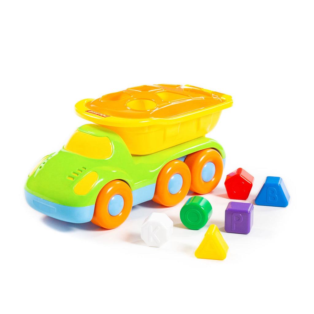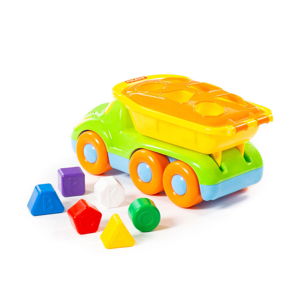 De Polesie Kiepvrachtwagen met vormensorteerder maakt spelen niet alleen leuk, maar ook onwijs leerzaam! Dit vrolijke vrachtwagentje heeft een kiepbak die omhoog en omlaag gezet kan worden. Over de kiepbak zit een gesloten deksel met openingen in de vorm van figuurtjes. Aan jou de taak om de meegeleverde vormpjes door het juiste gat te drukken! Nadat alle basisfiguren door het juiste gat zijn gedrukt, is de kiepbak van de kunststof vrachtwagen vol en kan je het gaan vervoeren. Eenmaal aangekomen op de bouwplaats zet je de kiepbak omhoog en haal je de deksel eraf om je lading te lossen. Geschikt vanaf 12 maanden.