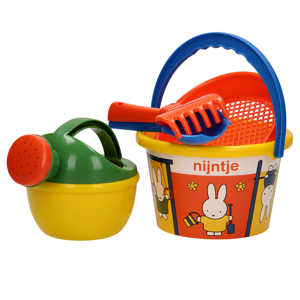 Neem deze Nijntje Strandset van Cavallino mee naar het strand voor veel speelplezier. De set bestaat uit 1 lage emmer, 1 zeef, 1 hark, 1 schep en 1 gieter. De strandset is gemaakt van stevig kunststof en op de emmer staan leuke afbeeldingen van Nijntje. De zeef kan als een deksel op de emmer geplaatst worden.