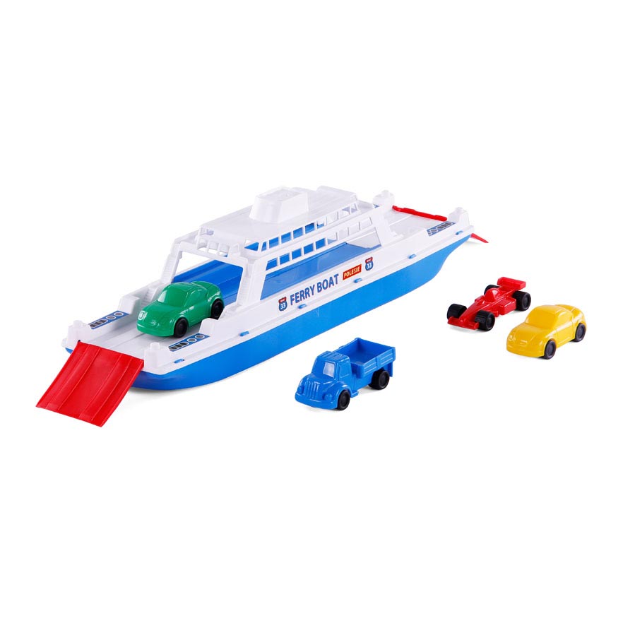 4-delige speelgoedveerboot met 3 autootjes. Gemaakt van kunststof. Afmetingen: 45,5 x 12,5 x 11,6 centimeter groot. Geschikt voor kinderen vanaf 12 maanden oud.