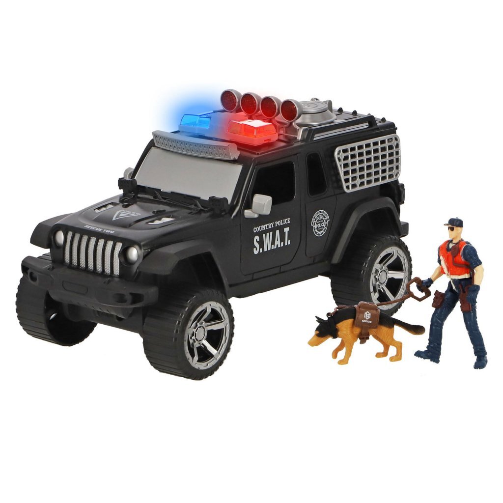Politieauto met licht- en geluidseffecten, inclusief speelfiguur van politieagent, politiehond en diverse accessoires. Geschikt voor kinderen vanaf 3 jaar.