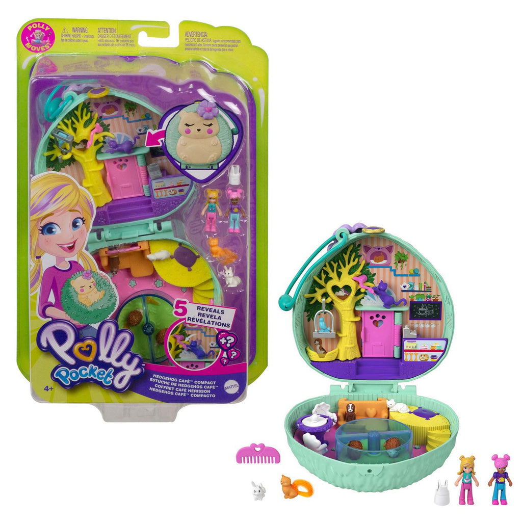 Tijd voor nieuwe avonturen met Polly Pocket! De grotere compacte speelkoffer Egelcafé heeft de vorm van een snoezige egel en bevat een minicafé en een dierenspeeltuin. Een leuke speelkoffer om thuis of onderweg mee te spelen. Ontdek samen met Polly en haar vriendinnetje (poppen met 5 beweegbare 'gewrichten') alle verrassingen in de speelkoffer. Natuurlijk hebben Polly en haar vriendinnetje ook 2 dierenvriendjes, een poes met een echte staart en een konijntje, en zijn er accessoires zoals een schort en een verborgen kam! Heb je zin in iets lekkers? Open de deur van het café en kies een tafeltje uit (draai de tafel en er staat eten op). Dan is het tijd om met de poesjes en de vogels in de boom te spelen en met het hondje op de bank. Draai de box van de egel en leg de poes op het poezenbed. Wat een leuke dag! De compacte speelkoffer heeft ook een handvat dat je om je pols kunt doen, zodat je overal en altijd op avontuur kunt gaan met Polly Pocket! Afwijkende kleuren en versieringen mogelijk. Een geweldig cadeau voor kinderen vanaf 4 jaar, vooral als ze graag lekkere hapjes maken, van dieren houden en het leuk vinden om ze te verzorgen!