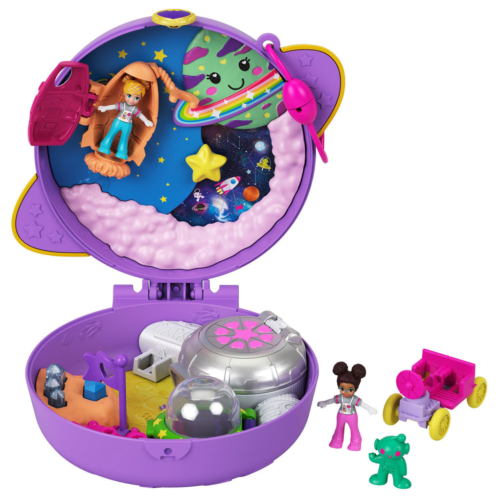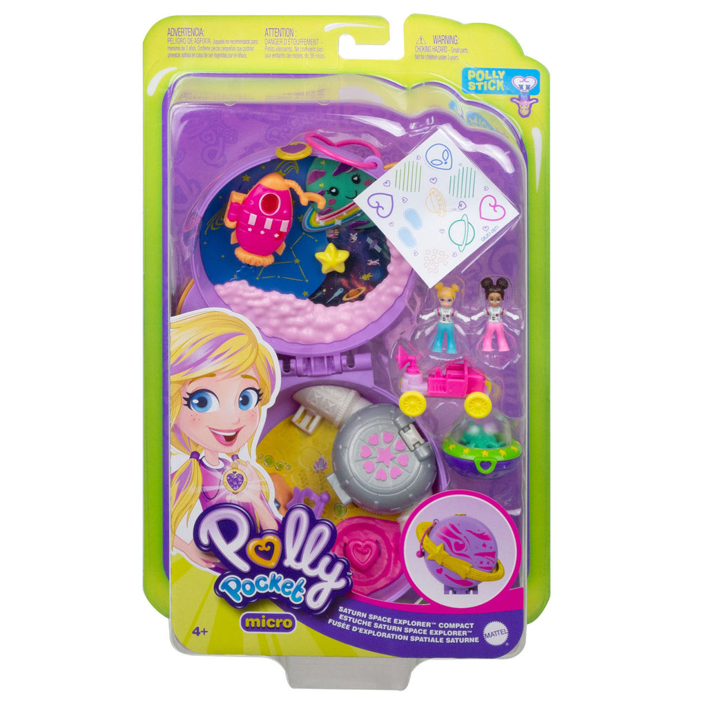 Tijd voor nieuwe avonturen met Polly Pocket! Neem deze spannende speelkoffer Saturnus Ruimteverkenner overal mee naartoe en beleef leuke avonturen in de ruimte! De speelkoffer heeft de vorm van de planeet Saturnus met kleurige topografie en een ring om de planeet, en bevat de micropoppen Polly en Shani, een uitneembaar maanvoertuig en een bevriend marsmannetje! Welke leuke activiteiten ontdek je in de speelkoffer? Het ruimtestation bevat een laboratorium en een slaapkamer, de bovenkant van de ufo kan open en biedt plaats aan één pop, met het maanvoertuig kun je ook buiten de speelkoffer spelen en daar passen twee poppen in, een ster draait zodat je verschillende beelden ziet en er komen kristallen tevoorschijn als je op een rotsachtig deel drukt! Bij de compacte speelkoffer zit een hengsel waardoor kinderen hem als armband of tas kunnen dragen! Dankzij de Polly Stick technologie kun je de micropoppen overal op de compact zetten. Plak een sticker van het stickervel (meegeleverd) op de Compact, zodat de poppetjes erop blijven staan. De Compact is klein genoeg om altijd en overal mee naartoe te nemen voor leuke Polly Pocket avonturen. Een geweldig cadeau voor kinderen vanaf 4 jaar, vooral voor kinderen die dol zijn op de ruimte, op wetenschap en op alles wat met sterren te maken heeft! Afwijkende kleuren en versieringen mogelijk.