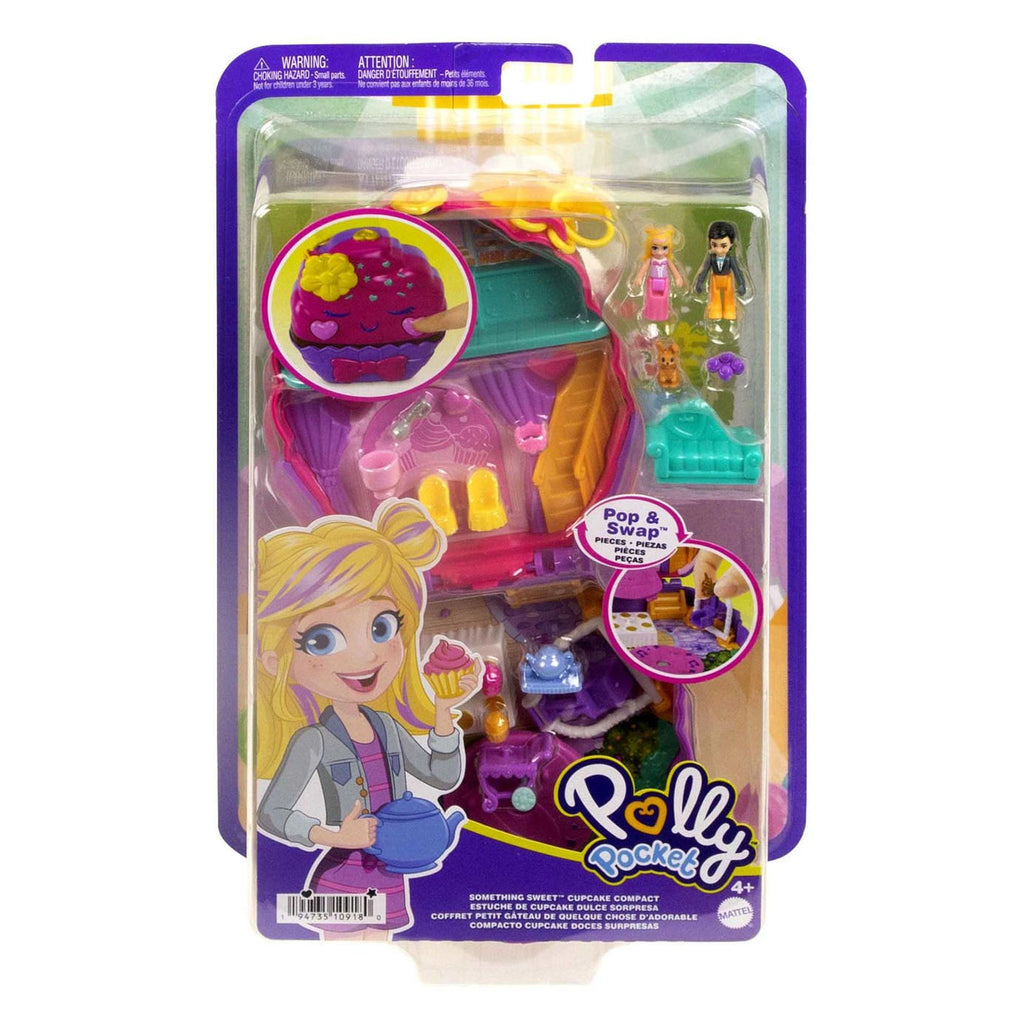 Deze Polly Pocket compacte cupcakespeelset Iets Zoets heeft een snoezige cupcake aan de buitenkant, met een polsbandje en wangetjes die heerlijk aanvoelen! Open de speelset en je vindt twee micropoppen, vijf bewegende onderdelen en 13 accessoires, waarvan je sommige kunt verwisselen. Bak heerlijke hapjes, swing op de dansvloer of organiseer een theefeestje met vrienden -- kids kunnen alle compacte speelsets verzamelen voor nog meer speelplezier! Een leuk cadeau voor kinderen vanaf 4 jaar. Per stuk verkrijgbaar en niet overal leverbaar. Kleuren en versieringen kunnen variren.
