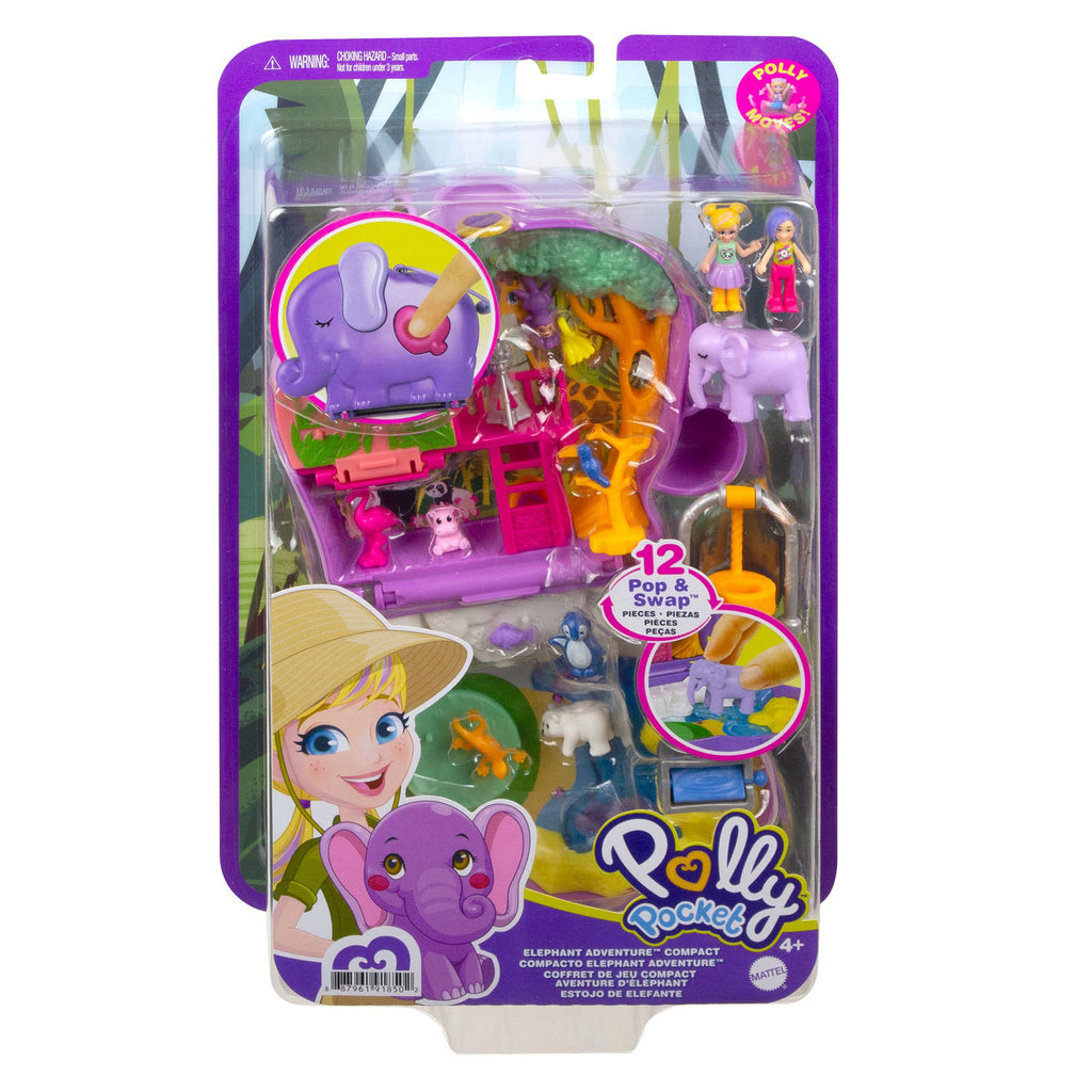 Bereid je voor op dierenpret met Polly Pocket! Met deze Olifantenavontuur compact in de vorm van een schattige olifant beleef je zowel thuis als onderweg eindeloos speelplezier. Aan de buitenkant ontdek je een schuimrubberen hartje waar je in kunt knijpen. Open de compacte speelkoffer en geniet van de leukste dierenavonturen, samen met de micropoppen van Polly en Bella (beide met 5 beweegbare gewrichten), 5 leuke verrassingen en 13 accessoires! Bedenk de leukste verhalen wanneer je de deur van de dierenkliniek openmaakt, op de touwschommel schommelt, de vloer laat draaien om de dieren te zien 'lopen', de trog omdraait om de dieren water of eten te geven en het aquarium ronddraait! Sommige accessoires hebben een Plop en Ruil pinnetje, zodat kinderen ze op verschillende speelplekken kunnen zetten voor eindeloze speelmogelijkheden! De compacte speelkoffer heeft ook een handvat dat je om je pols kunt doen, zodat je overal en altijd op avontuur kunt gaan met Polly Pocket! Afwijkende kleuren en versieringen mogelijk. Een fantastisch cadeau voor kinderen vanaf 4 jaar.