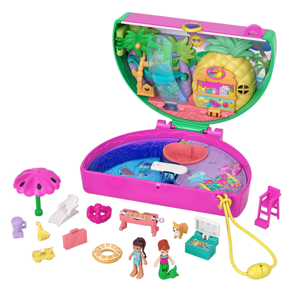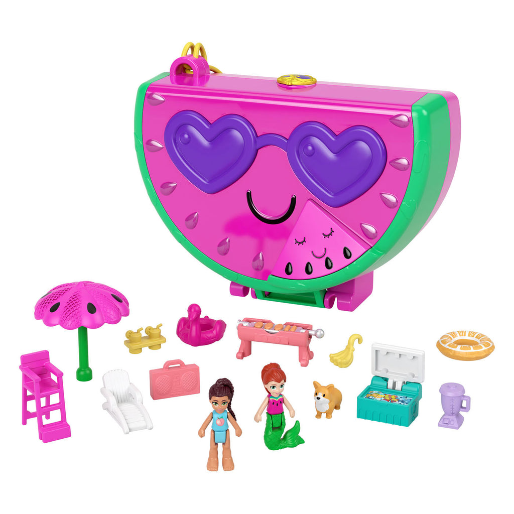 Ga lekker plonsen en spetteren met Polly Pocket! De compacte speelset Watermeloen Zwemfeestje heeft een feestje in een tropisch zwembad als thema en is perfect om thuis of onderweg mee te spelen. De buitenkant van de set ziet eruit als een watermeloen en heeft een geurtje. Binnenin vind je 5 leuke verrassingen, 12 accessoires en micropoppen Lila™ en haar zeemeerminnenvriendjes. Vul het zwembad met water voor volop spetterplezier en ontdek de leuke activiteiten: klap de waterglijbaan uit en laat de poppen in het water glijden, open het kraampje met ananassmoothies, laat de palmboom swingen en nog veel meer Sommige accessoires hebben een Plop en Ruil pinnetje, zodat kinderen ze op verschillende plekken kunnen zetten voor eindeloze speelmogelijkheden! Kleuren en versieringen kunnen variëren. Een fantastisch cadeau voor kinderen vanaf 4 jaar.
