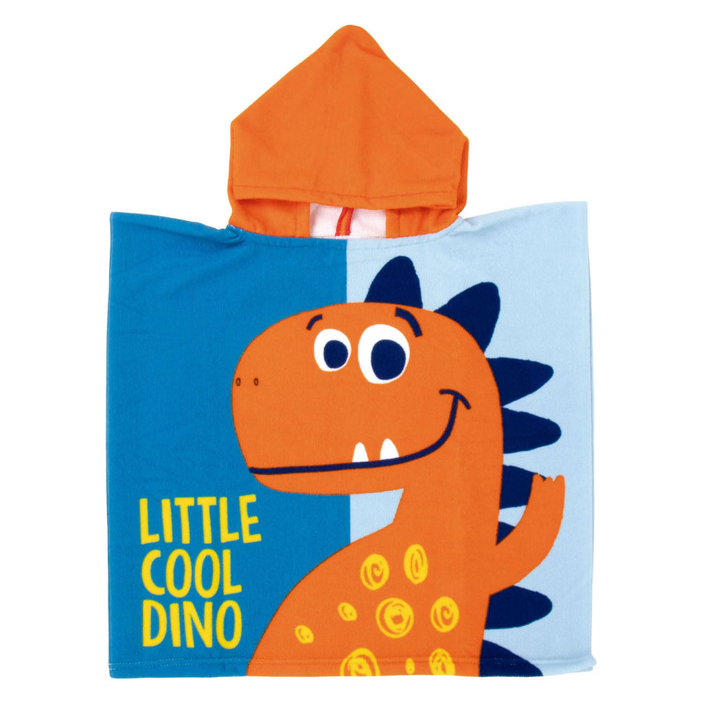 Poncho met afbeelding van een dino en de tekst 'Little Cool Dino'. 55 x 55 centimeter groot en gemaakt van microvezel.