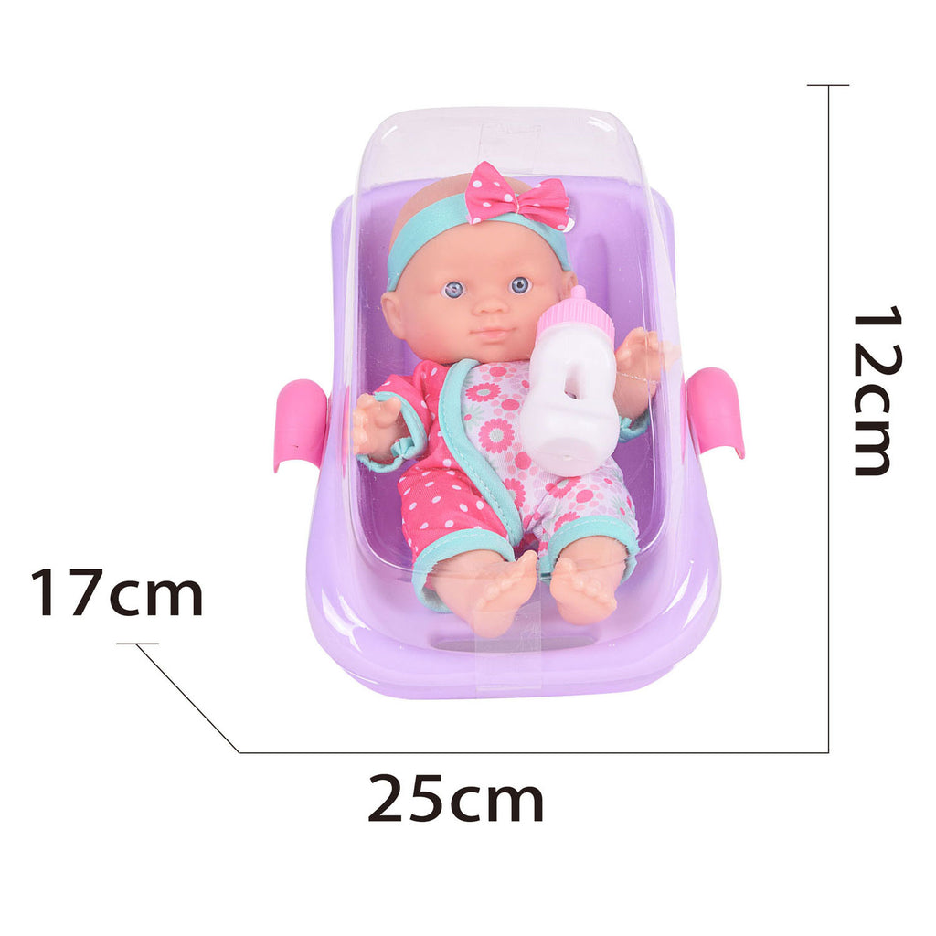 Pop met blauwe ogen in draagstoel. Het flesje heeft een gat wat makkelijk in het handje van de pop past. De pop is voorzien van een hippe outfit en een blauwe haarband met strik. De draagstoel is voorzien van twee clips voor bevestiging. Lengte pop 12 centimeter. Geschikt voor kinderen vanaf 3 jaar.