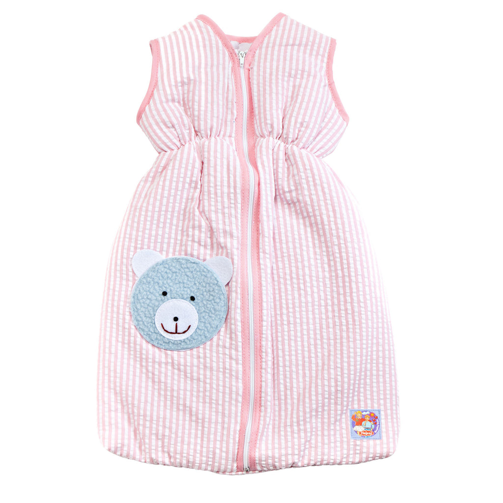 Je pop slaapt nog lekkerder in deze roze gestreepte slaapzak. De slaapzak heeft rits in de voorzijde en een elastieken band rondom de middel. Met het zoete schaapje voorop is je pop zo in dromenland! De slaapzak is geschikt voor poppen tot 50 cm. Inclusief houten kledinghanger.