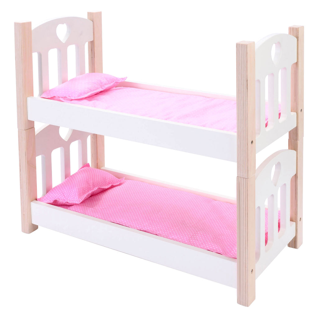 Het houten poppen stapelbed is aan elkaar te bevestigen d.m.v. magneten en is dus zowel als stapelbed én als losse bedjes te gebruiken. Het stapelbed wordt geleverd met matrasjes, dekentjes en kussentjes in het roze/ wit en is geschikt voor alle poppen!