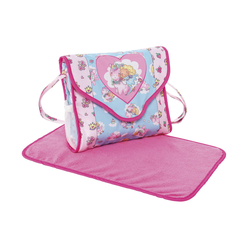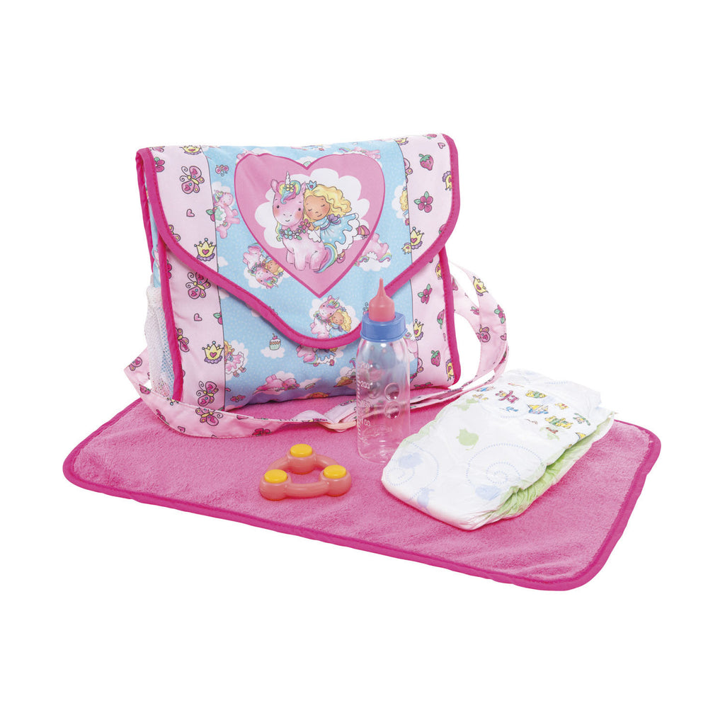 Poppen Verzorgingsset Eenhoorn. De luiertas heeft een schattige all-over print en is gevuld met een aankleedkussen, een luier, een kleine rammelaar en een fles.
