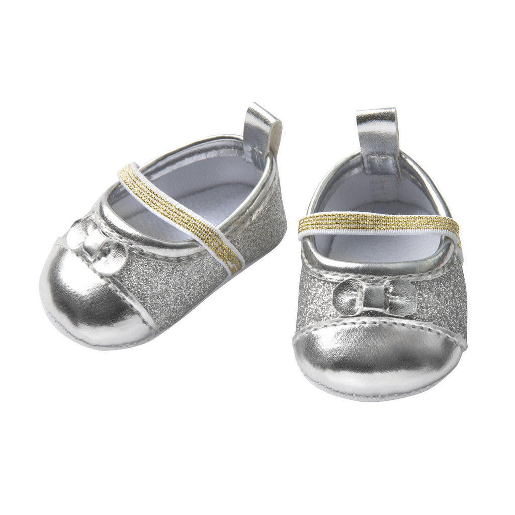 Deze zilveren ballerina's zullen jouw favoriete pop prachtig staan! Met het elastische bandje blijven de schoentjes goed zitten om de voeten van jouw pop. Het strikje bovenop de ballerina en de glitters aan de zijkant maken het helemaal af. De poppenballerina's zijn geschikt voor poppen van 30 tot 34 centimeter groot.