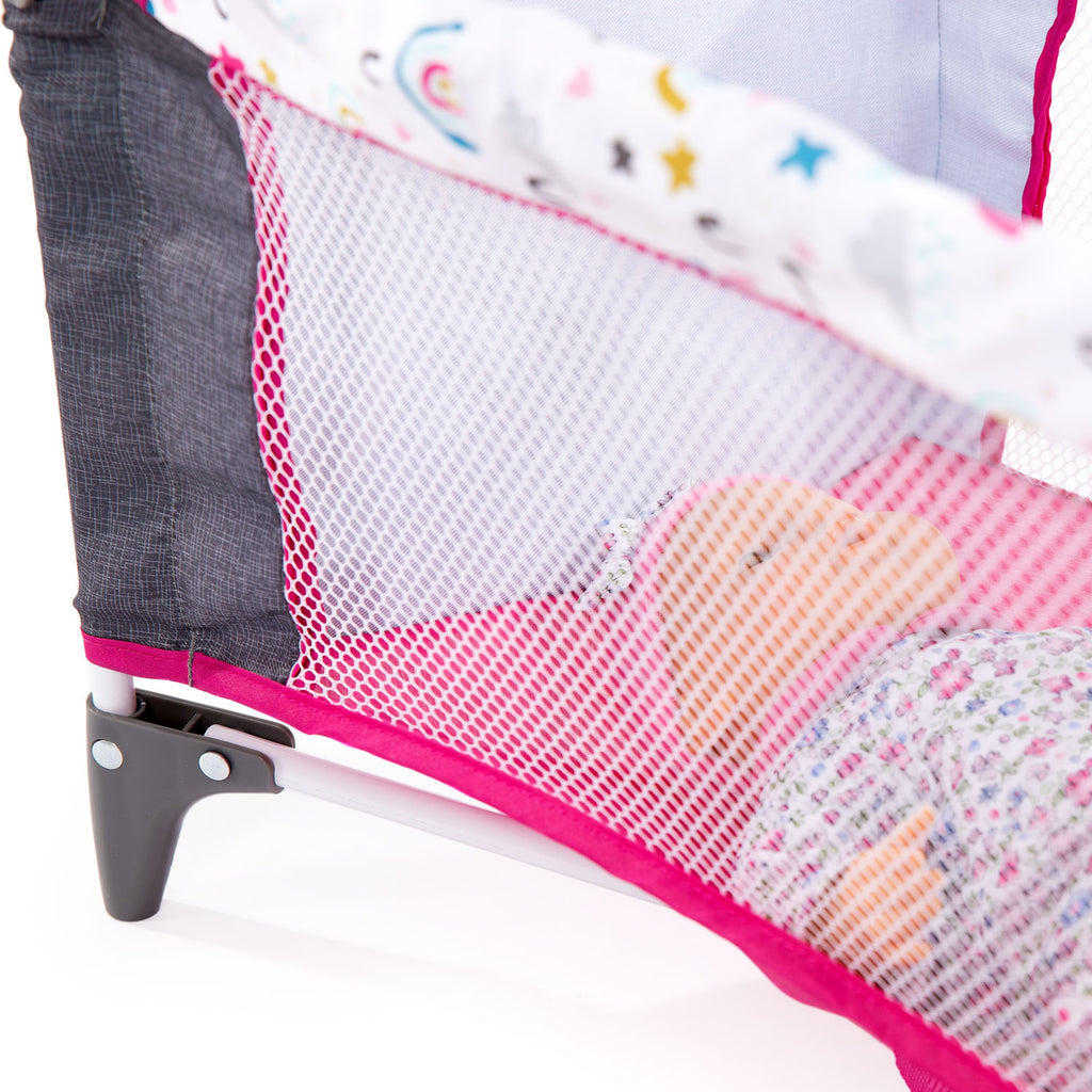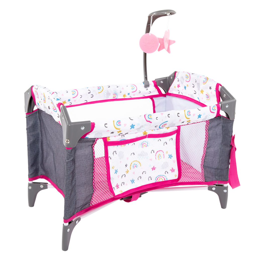 Het (camping)poppenbedje regenboog heeft kunststof wieltjes waarmee het bedje makkelijk te verplaatsen is. Aan de zijkant heeft het bedje opbergruimte voor kleine poppenaccessoires. De poppenmeubels zijn gemaakt van polyester, stevig metaal en kunststof.