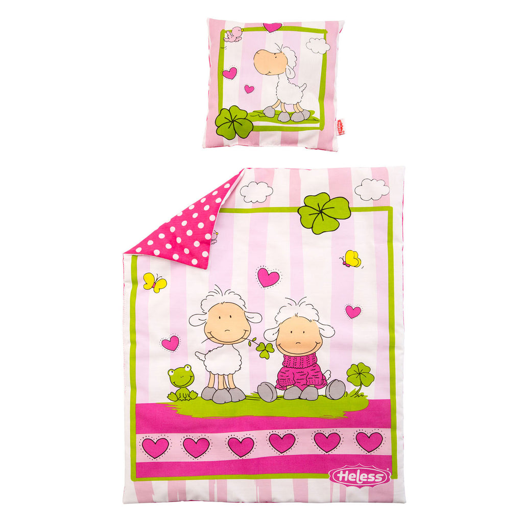 Je pop zal heerlijk slapen onder deze poppendeken met kussen. De poppendeken is tweezijdig bedrukt. De ene kant heeft een leuk wit/roze stippenpatroon en de andere kant een lieve afbeelding van 2 geluksschaapjes en een kikkertje. De kussen is ook tweezijdig bedrukt. De afmeting van de deken is 46 cm x 36 cm en van de kussen 17 cm x 17 cm.