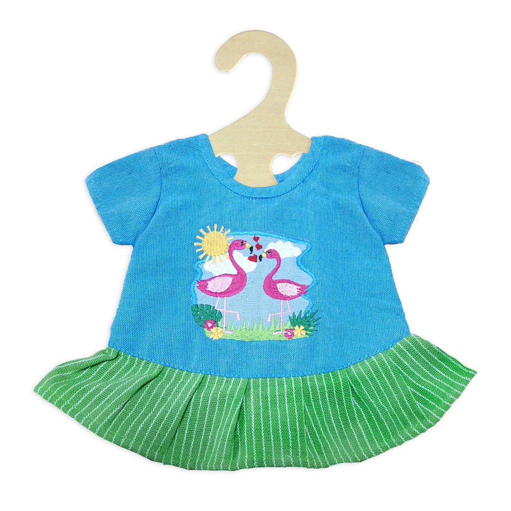 Deze schattige poppenjurk ziet er zomers uit. De top van het jurkje is blauw van kleur en er zijn 2 flamingo's op geborduurd. Het rokje is groen van kleur met witte strepen. De poppenjurk is gemakkelijk aan te trekken door middel van klittenband en geschikt voor poppen met een lengte van 28-35 cm. Fairtrade gemaakt.
