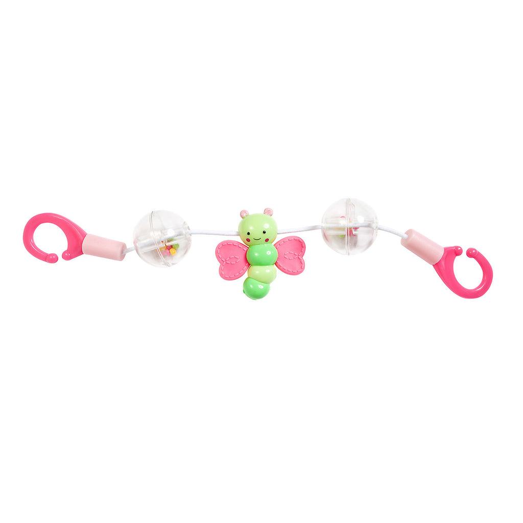 Vermaak je poppenbaby tijdens een lange wandeling met deze vrolijke rammelaar. Bevestig de rammelaar aan de poppenwagen met de twee haken aan het stevige elastieken koord. Door de draaiende balletjes in de transparante bal en het rupsje met een spiegeltje in haar achterzijde hoeft je pop zich geen moment te vervelen! De poppenwagen rammelaar is gemaakt van stevig kunststof in vrolijke kleuren.