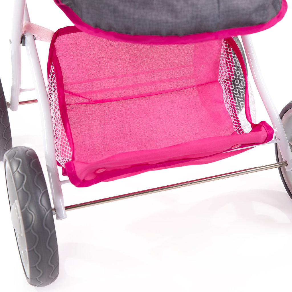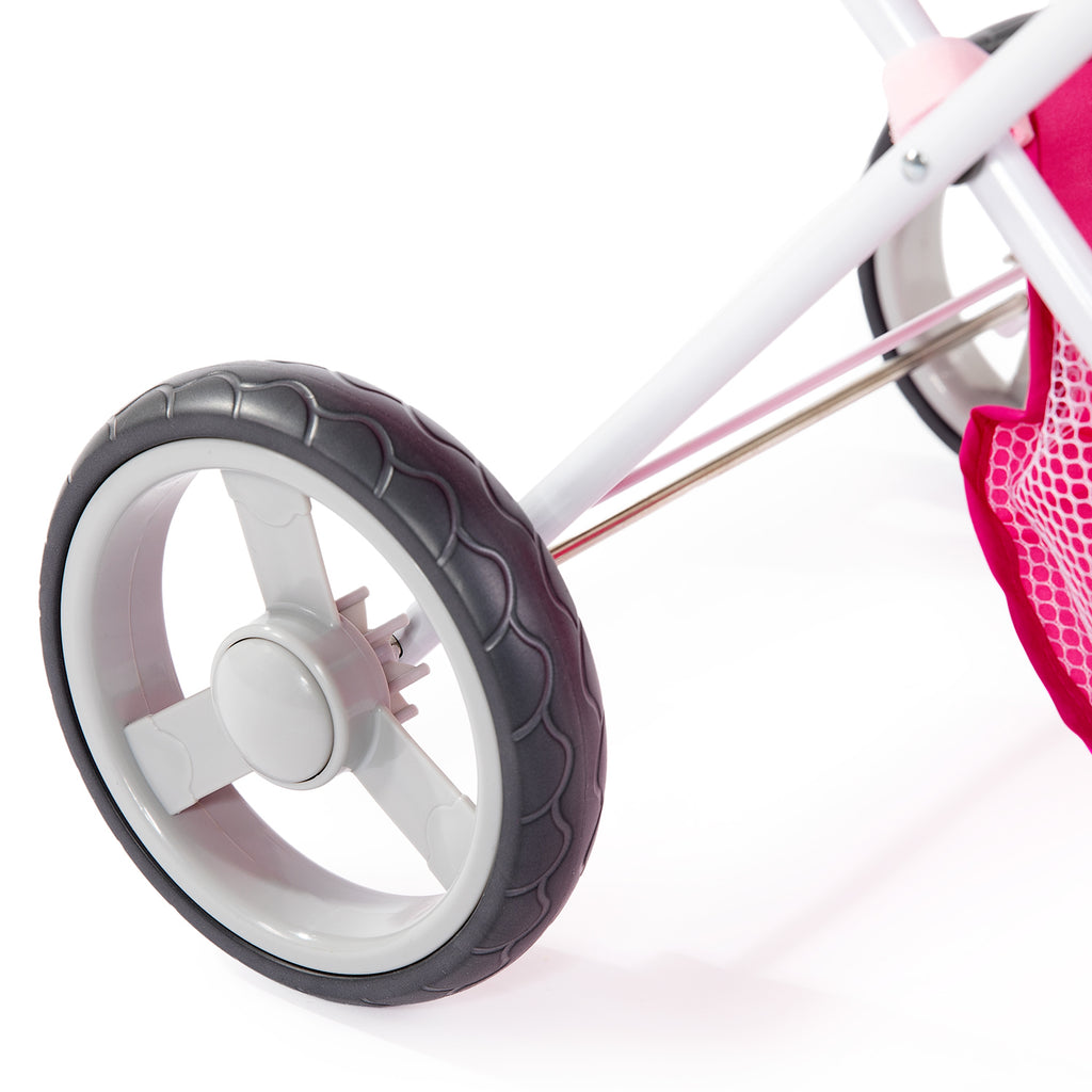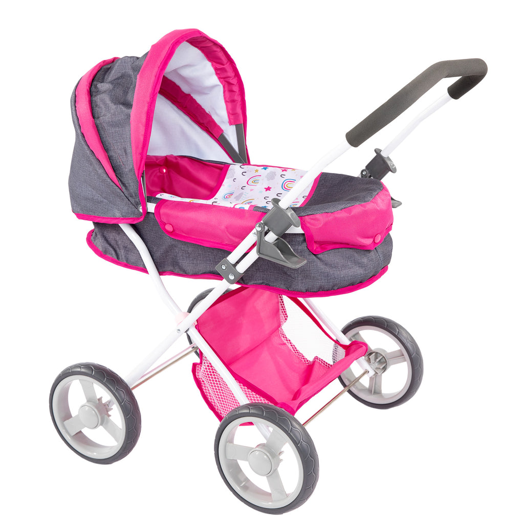 Grijs/roze poppenwagen met regenboogjes, dempende wielen en een zachte handgreep van comfortabel foam. Voor kleinere poppen tussen de circa 28 en 35 centimeter. Licht van gewicht, inklapbaar en eenvoudig in- en uit elkaar te halen om mee te nemen.