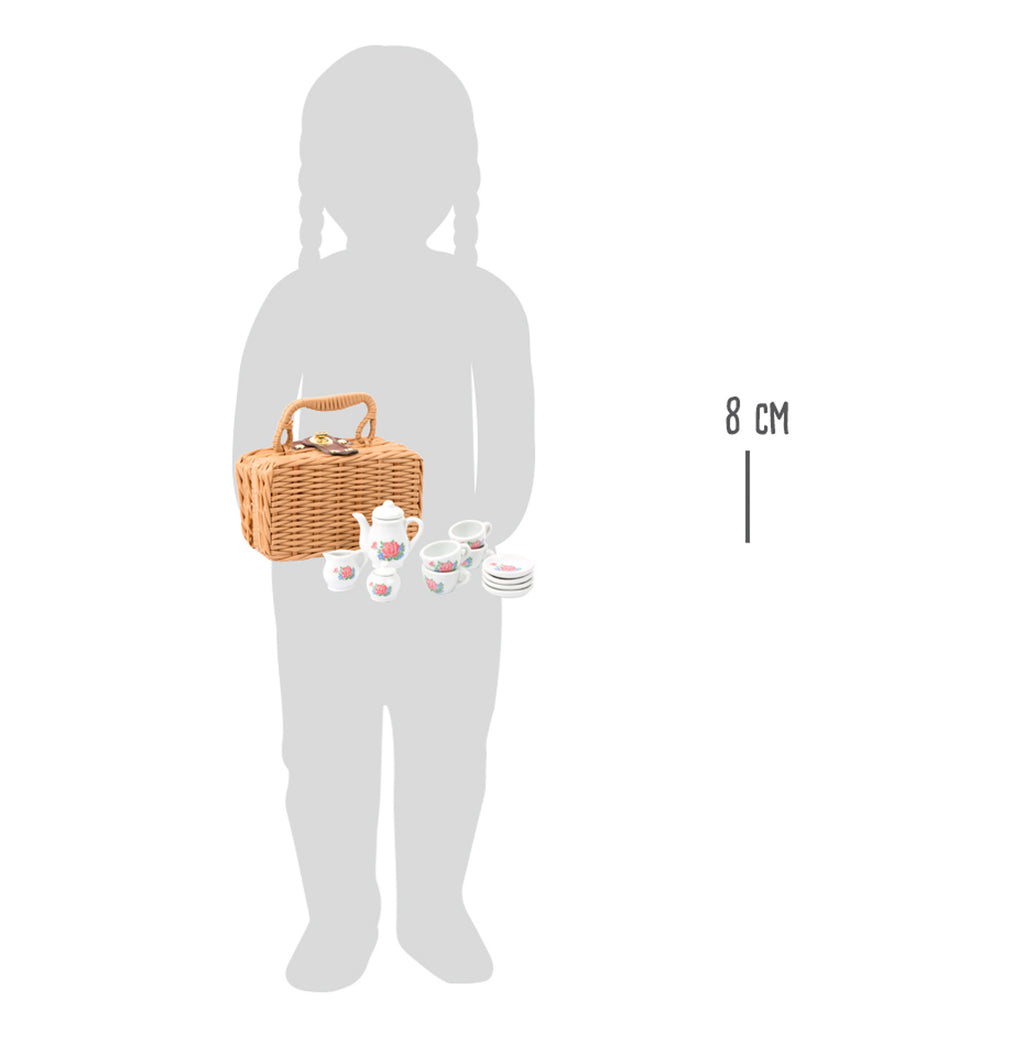 Laat de poppenpicknick beginnen! Het porseleinen koffieservies is bedrukt met mooie rozen en is geschikt voor een ontspannen koffiefeestje op het picknickkleed. Gevoerd met rood en wit geruite stof, heeft het geweven plastic etui een manchet met een draaisluiting om het porseleinen servies veilig te houden tijdens transport. Welke poppenouder kan dit weerstaan? Een geweldige aanvulling op het rollenspelassortiment.