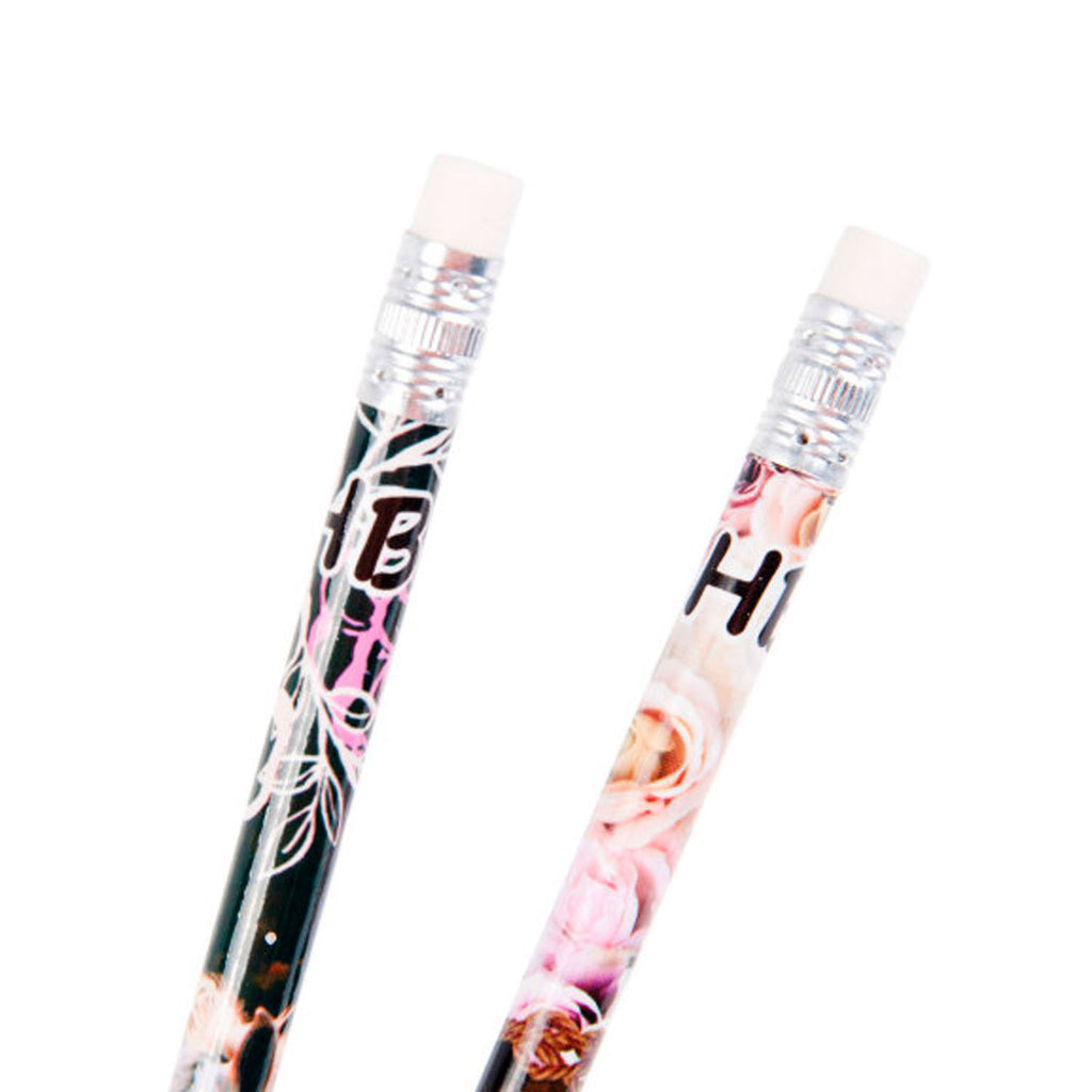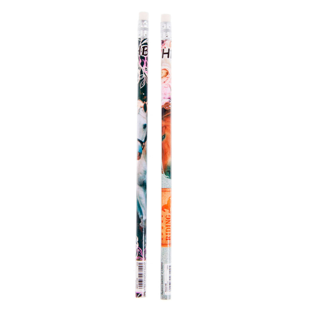 Set van gekleurde potloden met afbeeldingen van paarden erop. Bovenop het potlood zit een gum. Worden verkocht per 48 stuks.