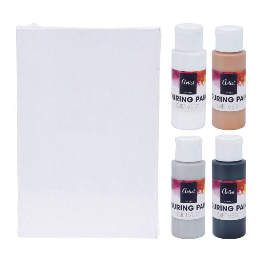 Set van 1 schilderscanvas van 10 x 15 centimeter en 4 tubes met elk 60 ml gietverf (wit, beige, grijs en zwart).