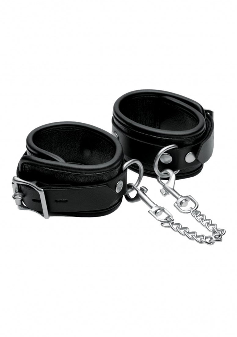 Deze comfortabele boeien zijn gemaakt van zacht en stevig leer. Doordat de gesp makkelijk te verstellen is, zijn de boeien eenvoudig om te doen en op maat te maken. De ketting tussen de boeien kun je verwijderen, zodat je eventueel touwen of andere accessoires aan de ringen kunt bevestigen. Ook zijn de gespen af te sluiten door hangsloten aan de haakjes te doen. Slotjes worden niet standaard meegeleverd.