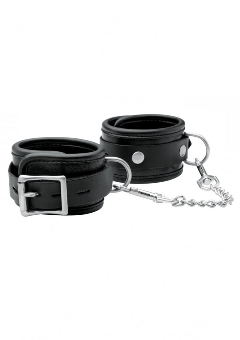 Deze eersteklas boeien zijn gemaakt van duurzaam, soepel aanvoelend eersteklas leer en hebben zilverkleurig beslag, nikkelvrij metaal, en een optionele vergrendelbare gesp voor extra veiligheid. De karabijnhaakketting in het midden is gemakkelijk te verwijderen, en aan de D-ring kun je naar wens touwen, kettingen, of andere accessoires bevestigen.